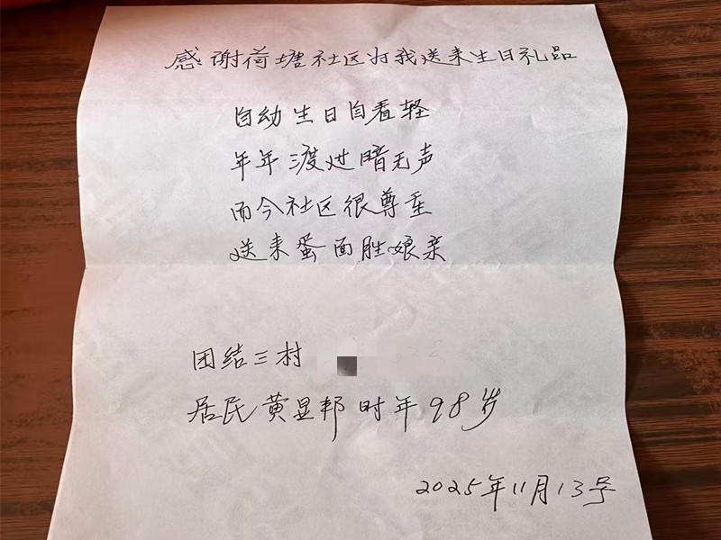 “自幼生日自看轻,年年度过暗无声。而今社区很尊重,送来蛋面胜娘亲!”近日,家住芜湖市镜湖区弋矶山街道荷塘社区团结三村小区98岁高龄的黄显邦,即兴创作了一首打油诗,用最朴实却最真 ...