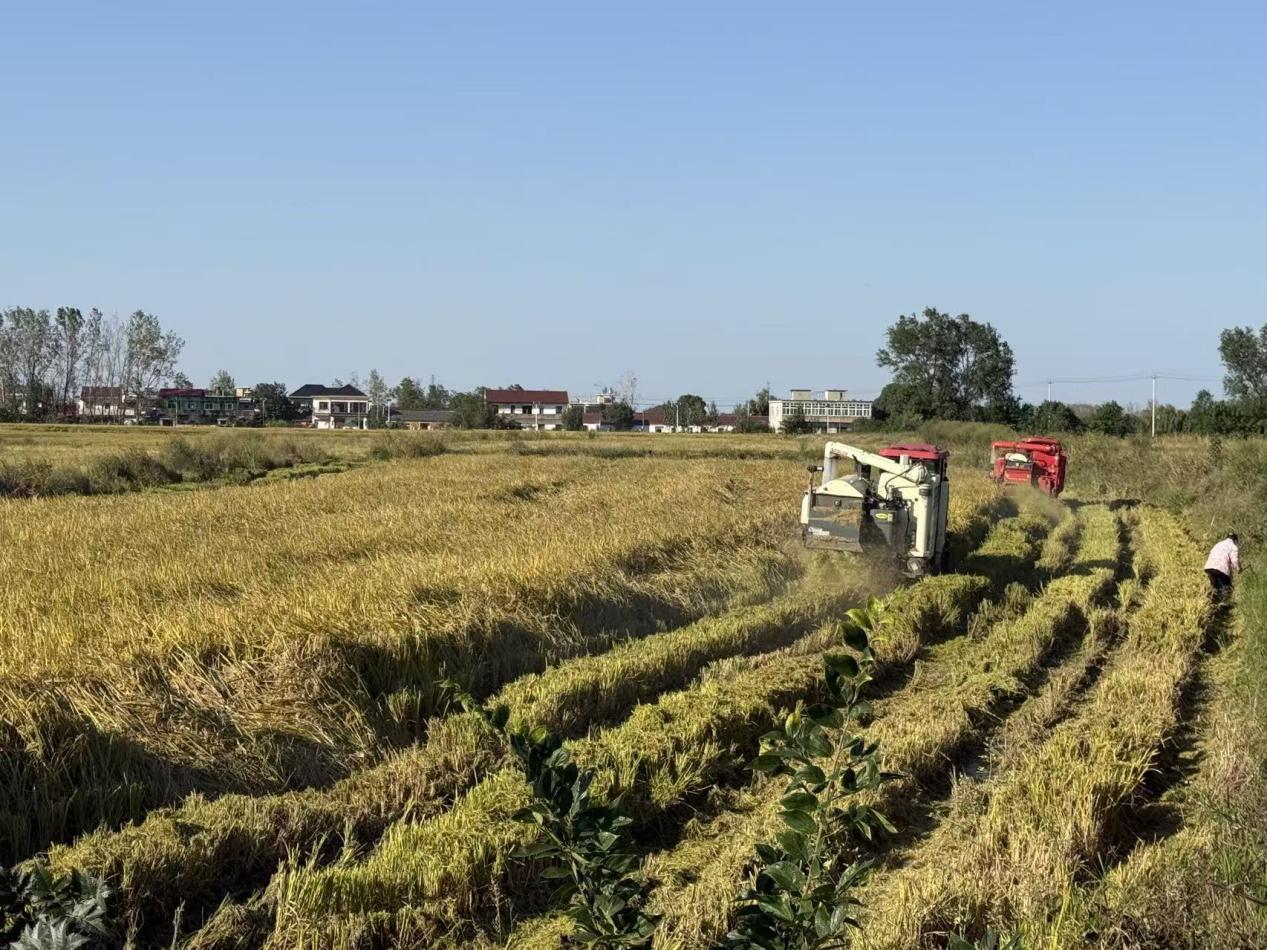 肥东县包公镇赤杨社区:金色稻田机声隆 秋收画卷正铺展