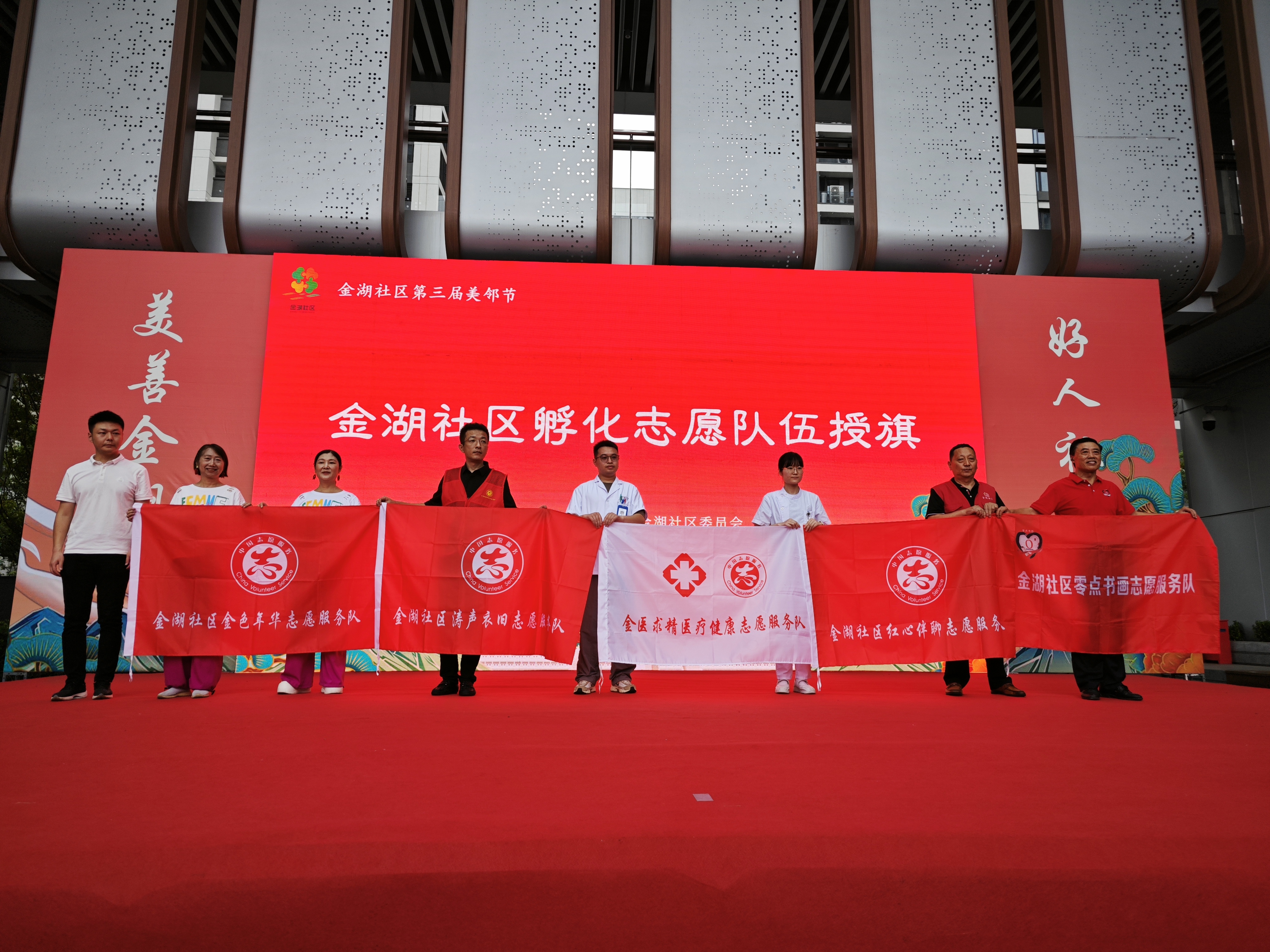近日,合肥市金湖社区以第三届美邻节为契机,由社区党委联合社区社会组织孵化园举办志愿队伍授旗仪式。以“蜀山好人”董何涛为代表的涛声衣旧志愿服务队、联动京东方医院与民众医院的金医 ...
