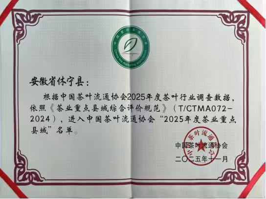 近日,休宁县在第二十一届中国茶业经济年会上被授予“2025年度茶业重点(原百强)县域”荣誉称号,黄山王光熙松萝茶业股份公司与黄山市新安源有机茶开发有限公司获得“2025年度茶业重点( ...