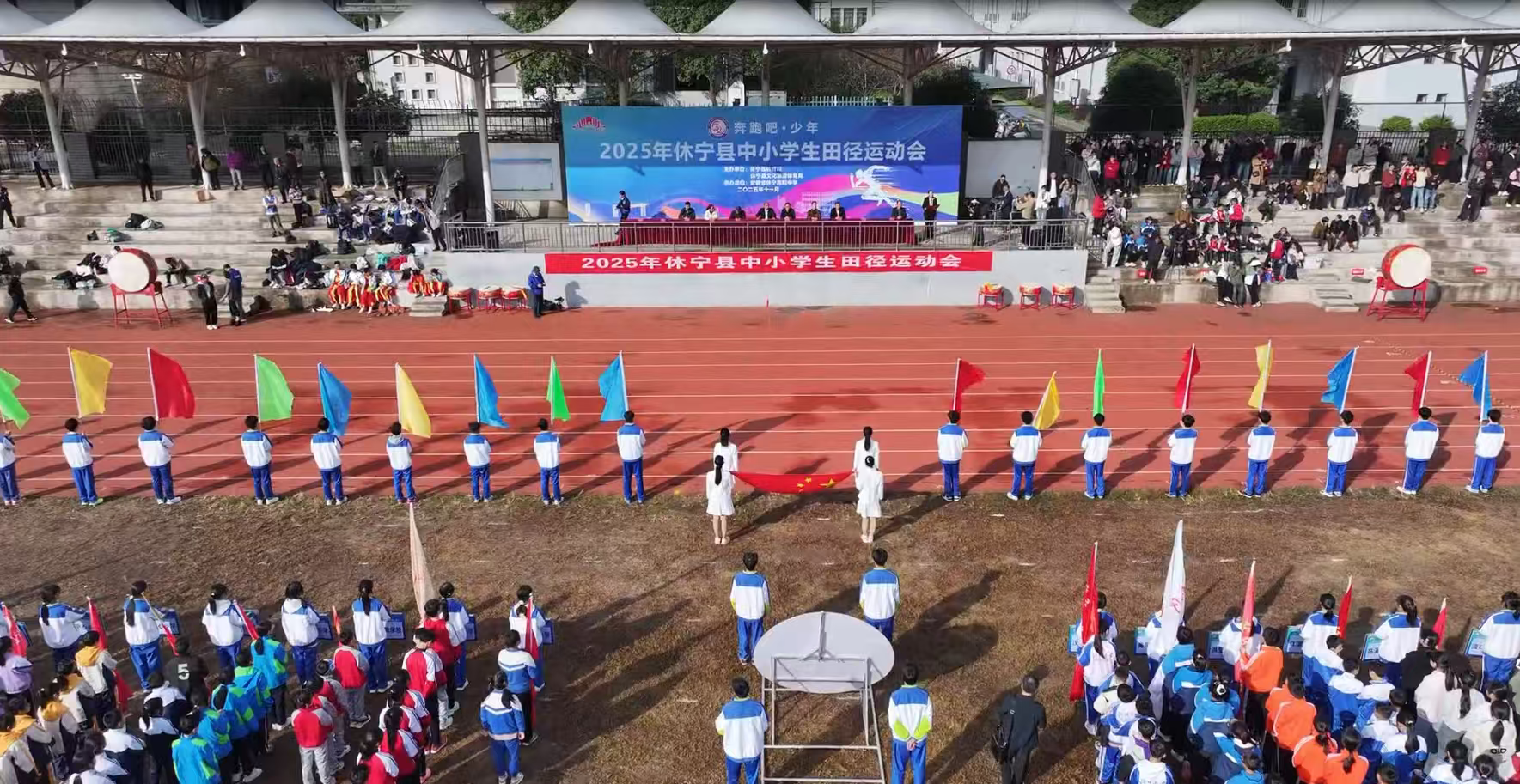 近日,休宁县体育场彩旗飘扬、鼓乐喧天,2025年休宁县中小学生田径运动会隆重开幕。本次运动会以“奔跑吧,少年”为主题,来自全县36所中小学的38支代表队、400余名运动员将在为期3天的赛 ...