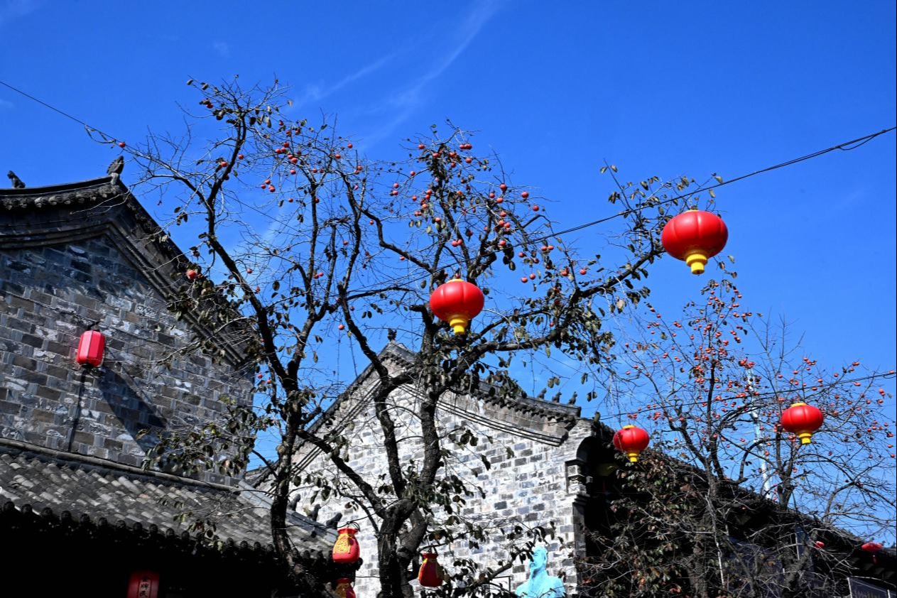 11月5日,在颍上县滨河大道,沿途一望无际的柿树排列两侧,鲜红饱满的柿子缀满枝头,红红火火,在蓝天映衬下,宛如一幅绝美画卷。