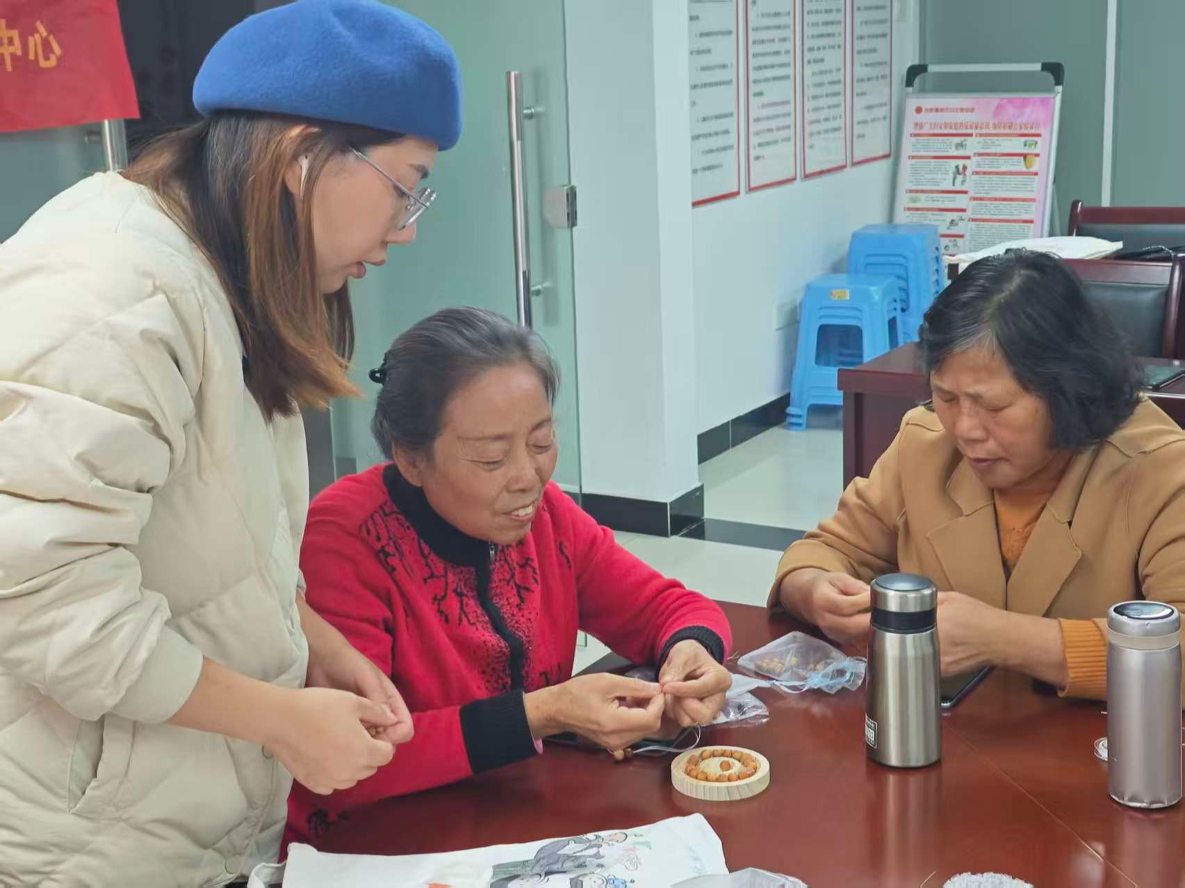 10月22日,合肥高新区天乐老少活动家园内一片热闹祥和的景象,欢声笑语此起彼伏,20余位社区老人围坐在长桌前,全神贯注地将艾草、决明子、薰衣草等中药材精心串成五彩手链。