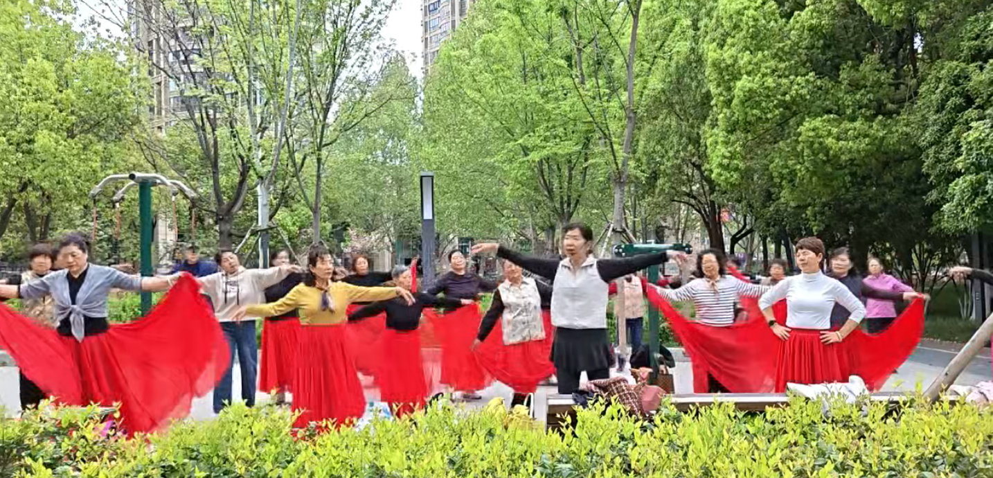 4月8日下午,合肥市蜀山区笔架山街道汇林公园小广场上音乐悠扬、舞步轻快,汇林阁社区老年学校现代健身舞班开课。
