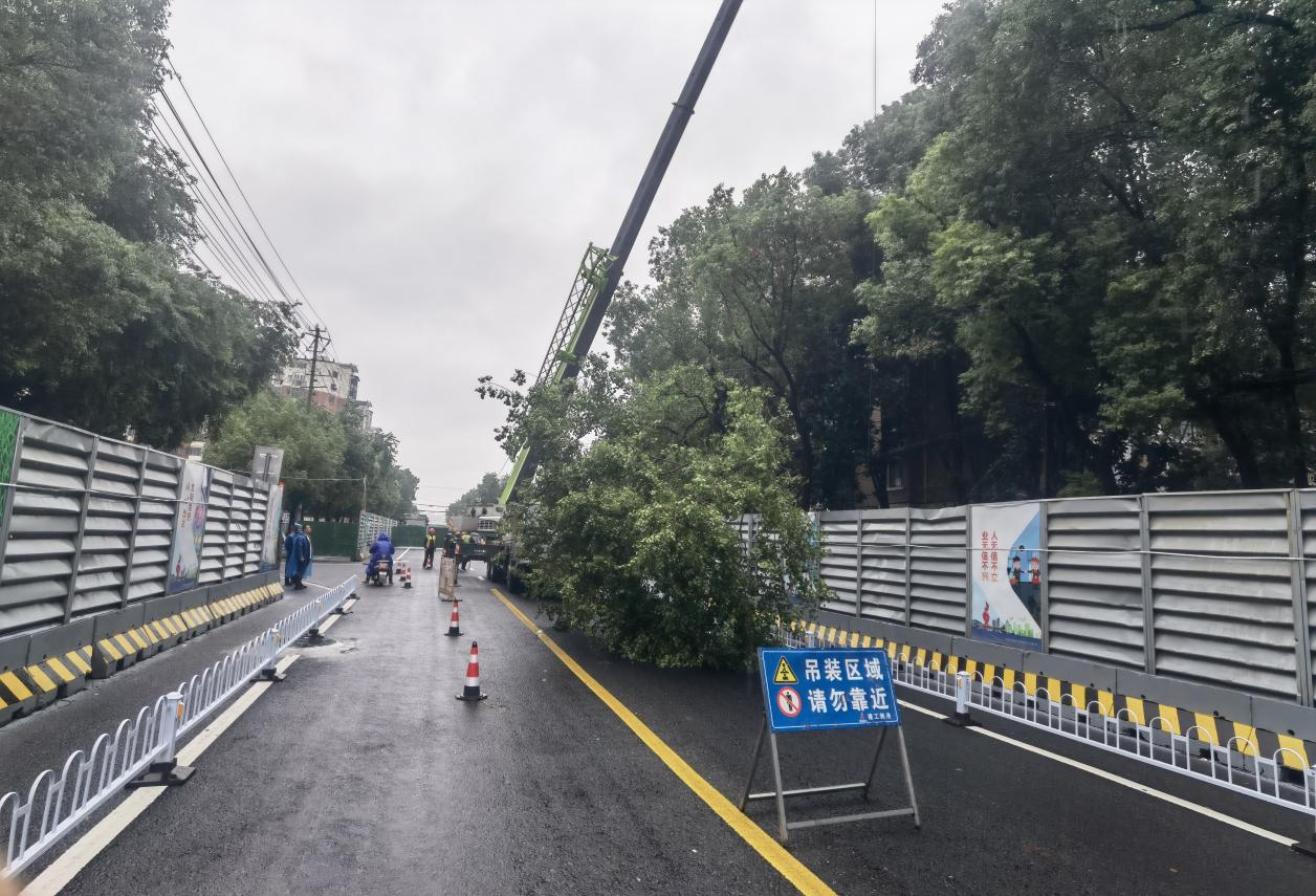9月24日夜间,受台风降雨天气影响,青阳路箱涵管网改造项目颐和花园一侧的两棵行道树发生倾倒,不仅影响道路通行,还存在安全隐患。