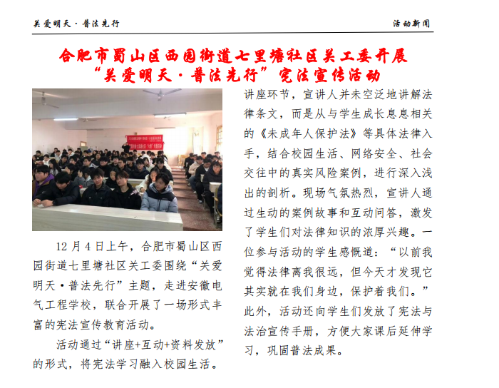 近日,安徽省第五届“关爱明天·普法先行”青少年法治宣传教育活动简报公布了全省优秀案例,蜀山区西园街道七里塘社区、安居苑社区开展的宪法宣传教育活动成功入选,成为全市青少年法治教 ...