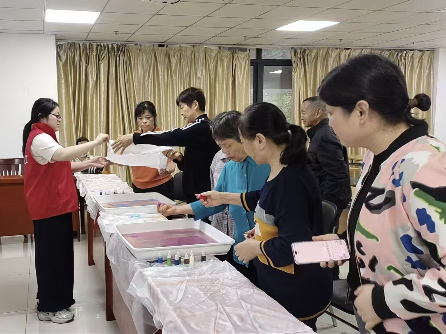 9月29日下午,在合肥市蜀山区民政局指导下,荷叶地街道社会事务办携手蜀山区北斗星社会工作服务中心组织开展水拓丝巾创作活动,10位低保老人在社工带领下,通过水拓丝巾创作体验,在艺术互...