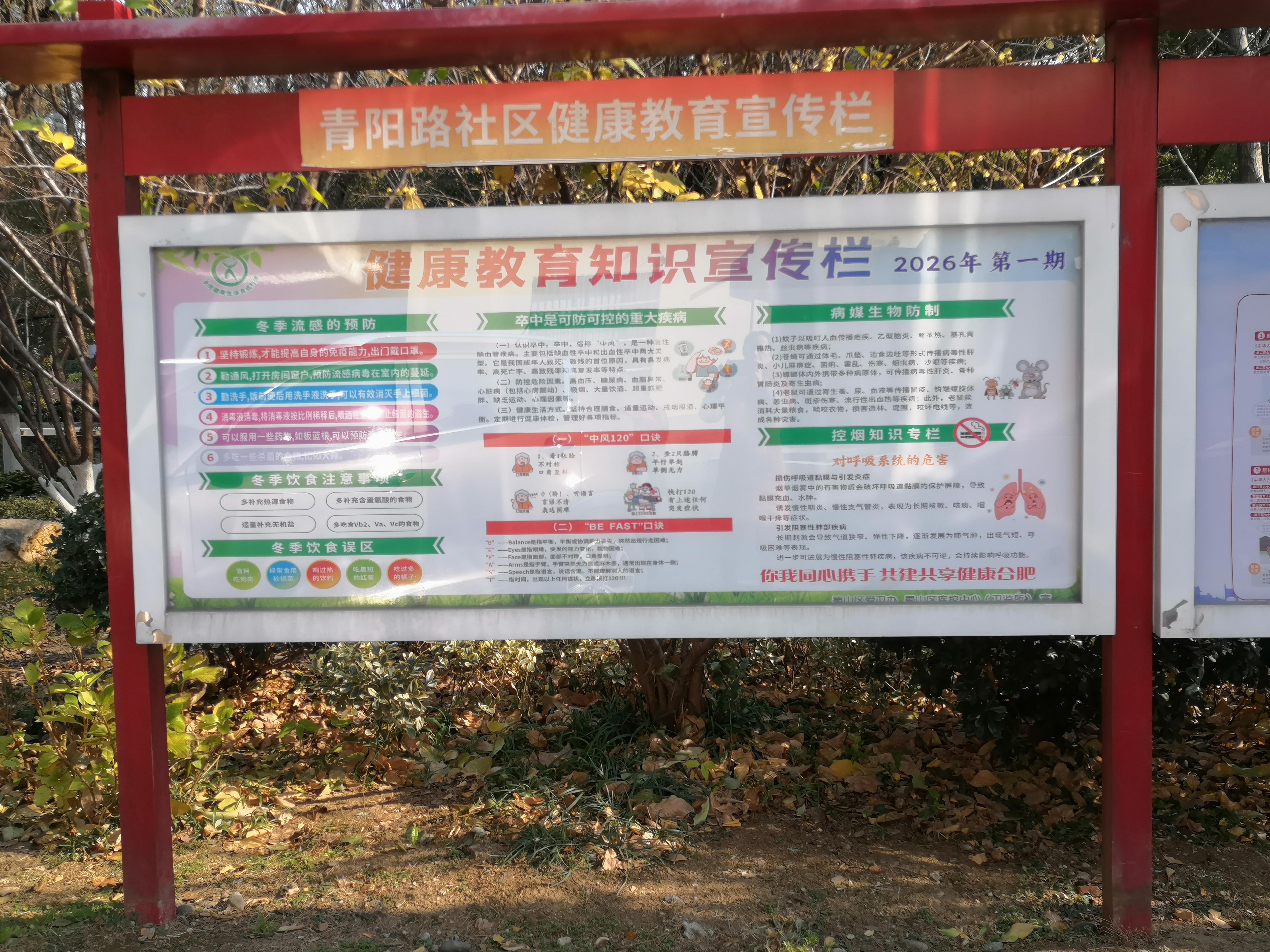 冬季来临,合肥市蜀山区五里墩街道青阳路社区健康教育宣传栏也焕然一新,换上了新的一期形式活泼,内容丰富的健康教育专栏。