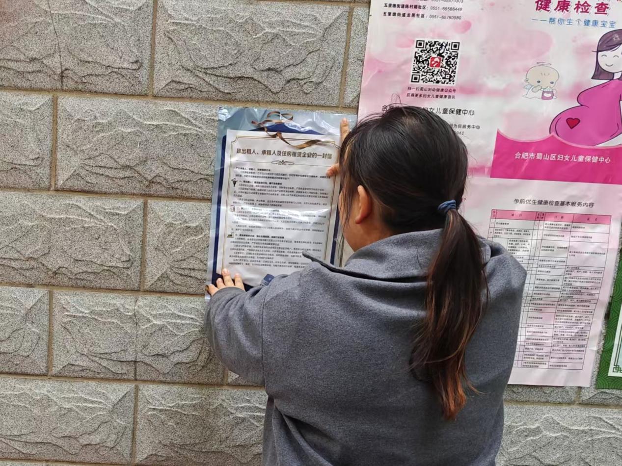 近日,合肥市蜀山区五里墩街道青阳路社区工作人员深入各小区楼栋,张贴《致出租人、承租人及住房租赁企业的一封信》,旨在规范住房租赁市场秩序,共建安全、文明、和谐的社区居住环境。