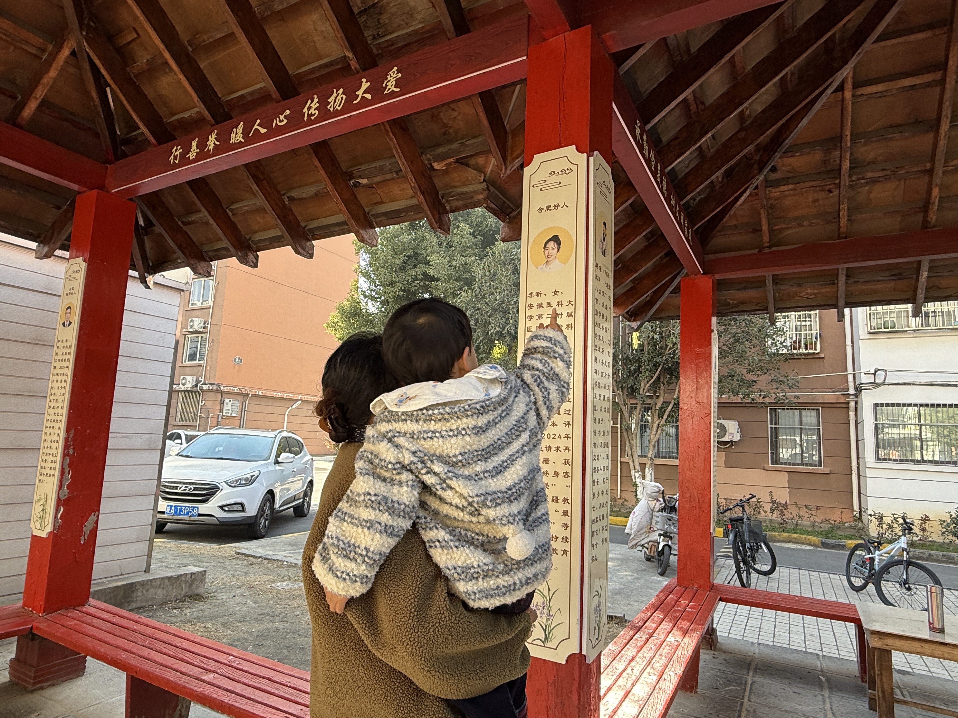 清晨阳光透过崭新廊檐,在石阶洒下温润光影。几位老人围坐木栏旁闲谈,孩童绕着亭柱嬉戏,目光不时被柱上文字吸引。这幅惬意的生活图景,正是合肥经开区莲花中心公交锦绣园小区旧凉亭改造 ...