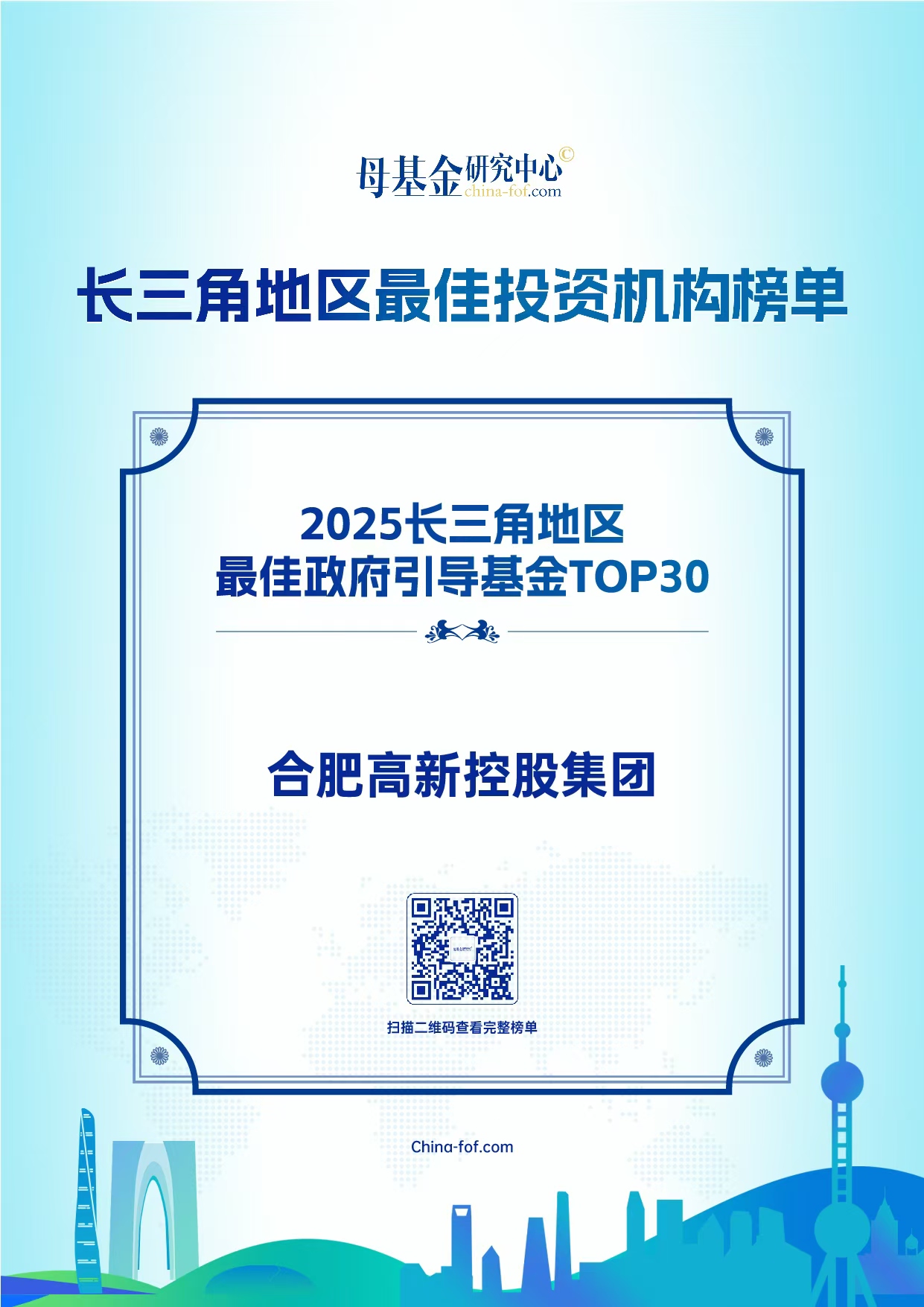 9月26日,由母基金研究中心发布的2025长三角地区最佳投资机构榜单正式揭晓,合肥高新控股集团成功入选“2025长三角地区最佳政府引导基金TOP30”。