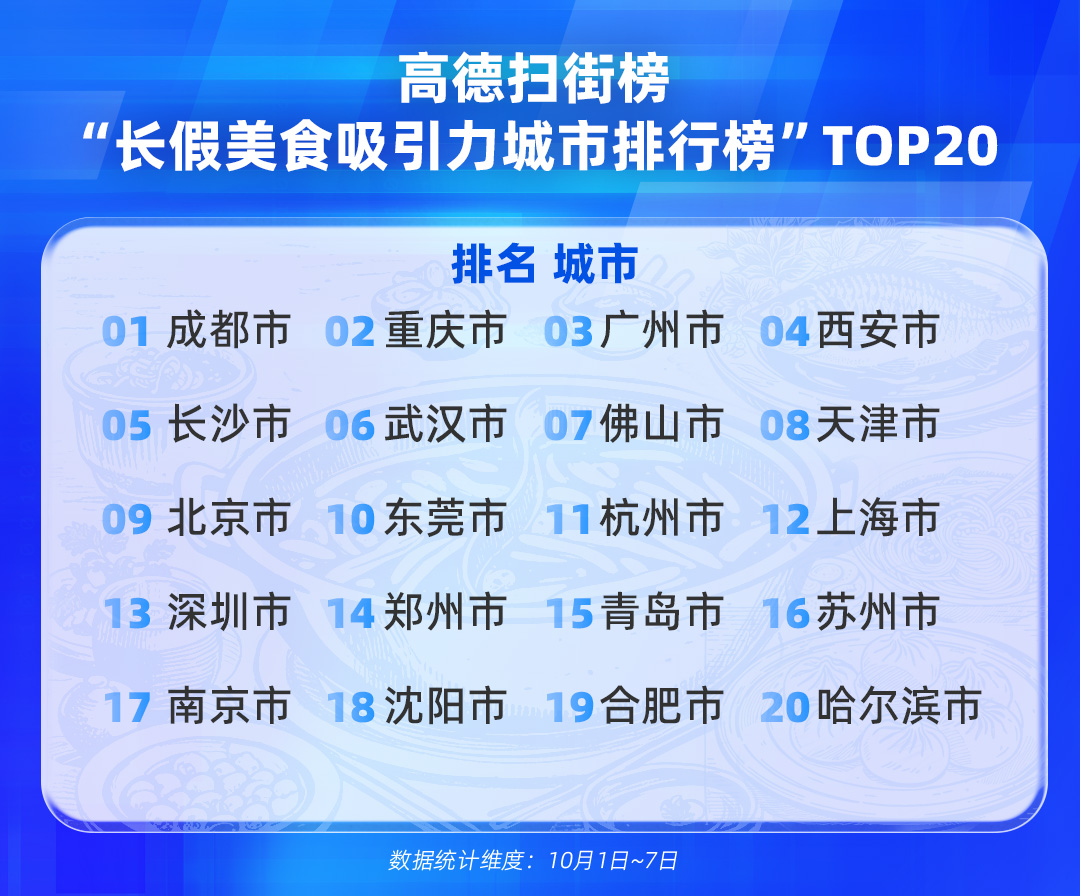 2025-10-17 11:41:14《高德扫街榜2025国庆中秋长假出行消费报告》发布 合肥入选“长假美食吸引力城市排行榜”TOP20