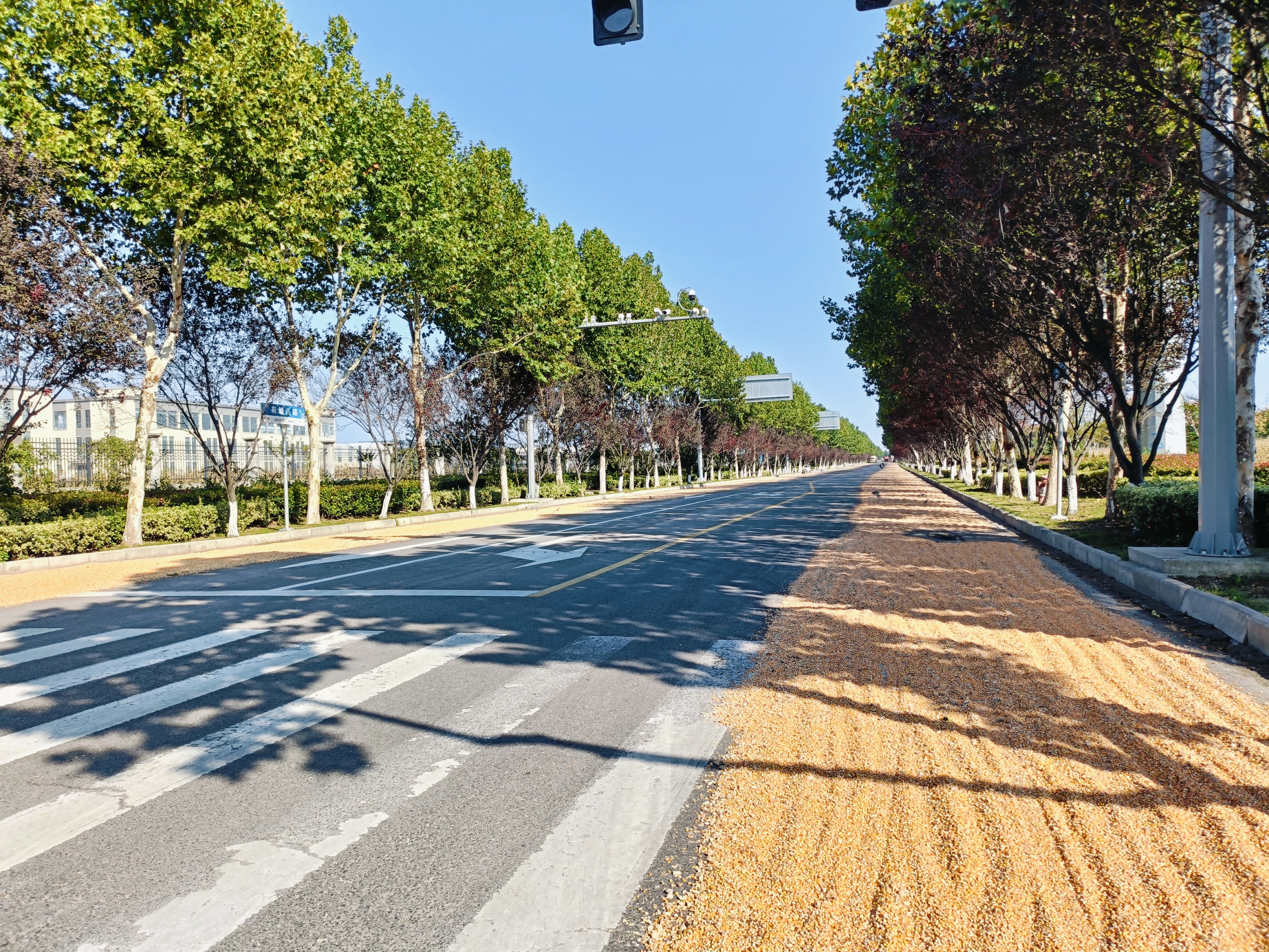 10月22日,雨过天晴,宿州市埇桥区广大农民掀起晾晒秋粮热潮。在不大影响交通的情况下,利用临近道路边道和一切能利用的场地晾晒玉米、大豆等,把秋汛带来的影响降到最低限度。