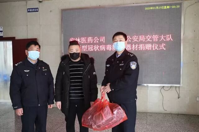 1月27日上午,凤台县安沐医药公司负责人踏积雪,冒严寒,来到全员上班的凤台县公安局交管大队,将市场上紧缺的医用防护口罩1000支捐赠给防控一线执勤的交通民警和辅警。