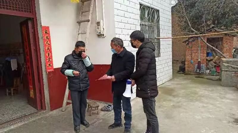 图为金寨县麻埠镇桂花村党支部书记郭明会入户宣传防疫知识