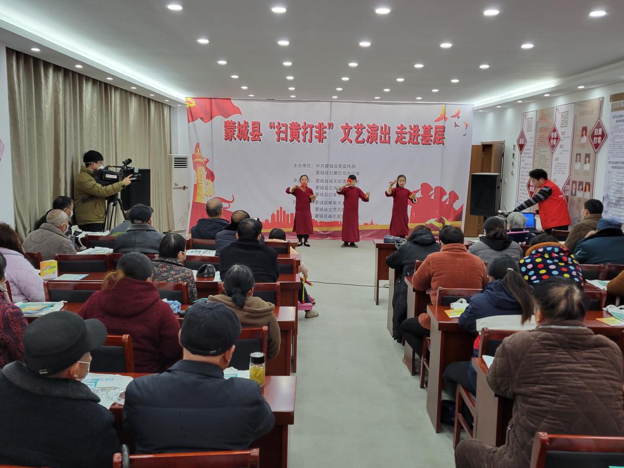 为进一步加大扫黄打非工作宣传力度,发挥“扫黄打非”基层站点作用,1月14日,蒙城县“扫黄打非”文艺进基层演出在城关街道办事处望月社区举行。活动通过小品、舞蹈及快板等丰富多样的形式向居民群众宣传“扫黄打非”知识,给基层群众呈现了一台主题鲜明、别具一格、观赏性强、充满正能量的文艺演出。