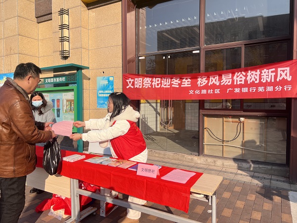 冬至来临,为切实推进新时代精神文明建设,弘扬社会文明新风尚,芜湖市张家山街道文化路社区新时代文明实践站开展“文明祭祀迎冬至 移风易俗树新风”主题宣传活动。此次活动旨在引导社区居民摒弃陈规陋习,树立文明新风。