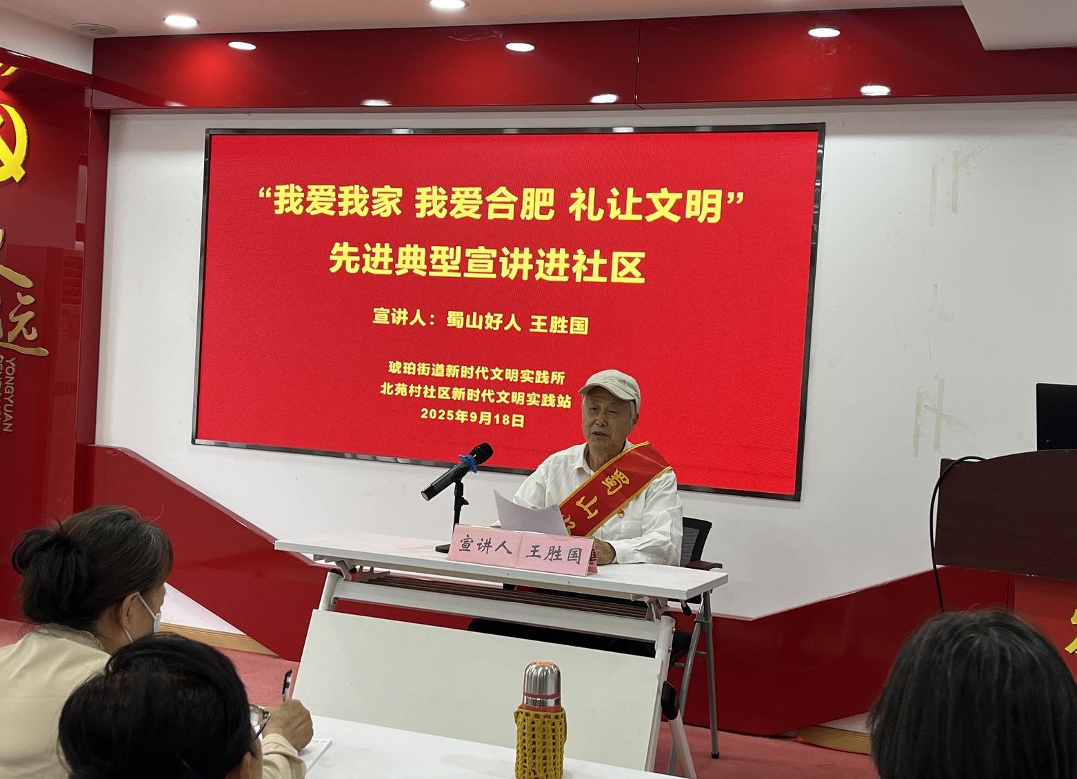 9月18日下午,合肥市蜀山区琥珀街道北苑村社区新时代文明实践站热闹非凡,一场以“我爱我家 我爱合肥 礼让文明”为主题的先进典型进社区活动在此温情启幕。活动特别邀请到蜀山好人、爱心探访队队长王胜国,围绕“以志愿微光,聚治理暖流—我的社区服务之路”这一核心主题,与辖区居民、物业代表及社区工作人员共30余人,分享他深耕社区志愿服务的动人故事与深刻感悟。
