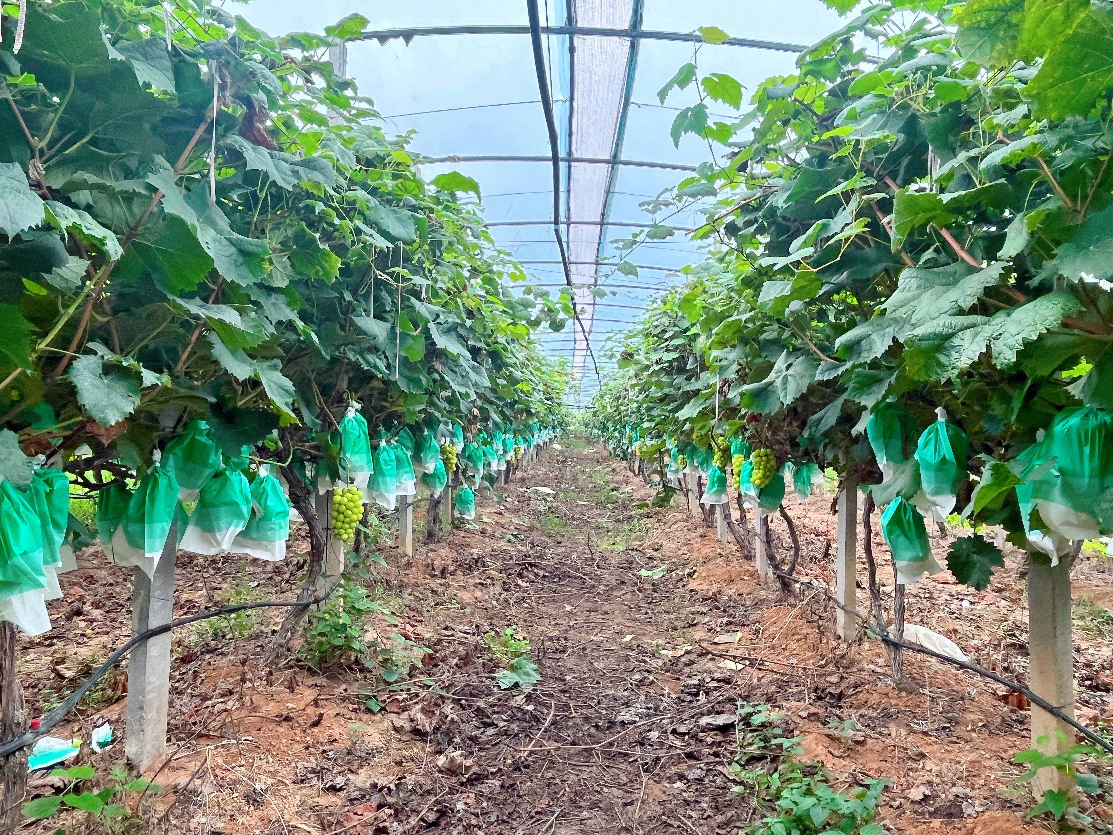 为保证“阳光玫瑰”葡萄的品质和口感,基地严格控制葡萄的串行和产量,每根藤蔓上只留一串葡萄,每串在60到80粒,确保糖度、风味。“我们基地内的葡萄分别被套上白色、白蓝相间、蓝色、绿色4种袋子,套上不同颜色的袋子可以调节葡萄的成熟速度和色泽,套白色袋子的葡萄吸收阳光好最早成熟,套绿色袋子的葡萄成熟晚,这样能保证葡萄上糖足,甜度好,葡萄成熟时间不同一定程度上缓解了销售压力。”合作社负责人金伟介绍说道。