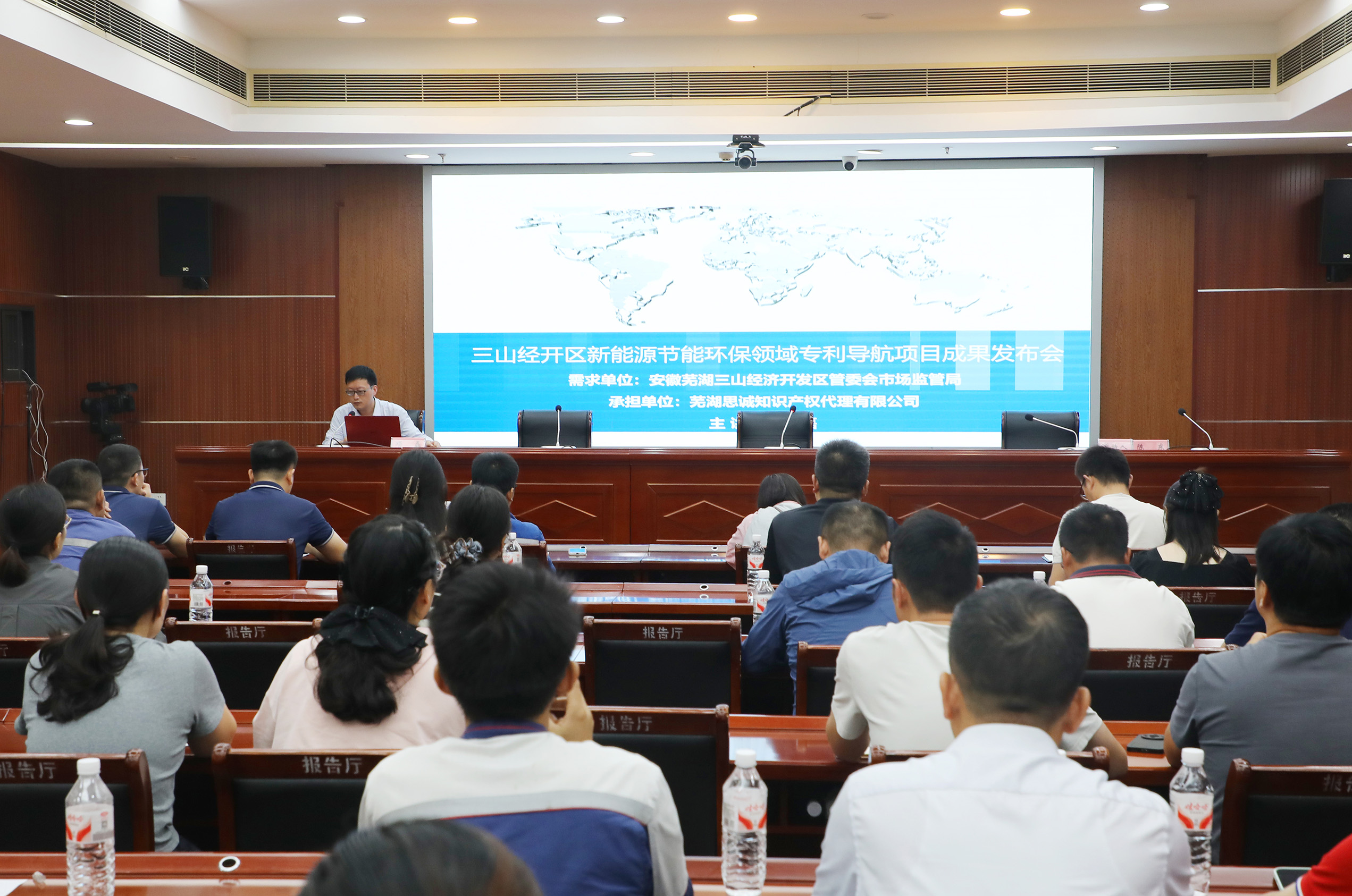 根据会议安排,三山经济开发区新能源节能环保领域专利导航项目成果发布会随即举行。第三方代理机构项目负责人围绕项目概况、产业整体现状、专利态势分析、关键技术领域发展研判、开发区产业发展定位与路径,以及产业决策需求与建议等核心成果,进行了详细解读。