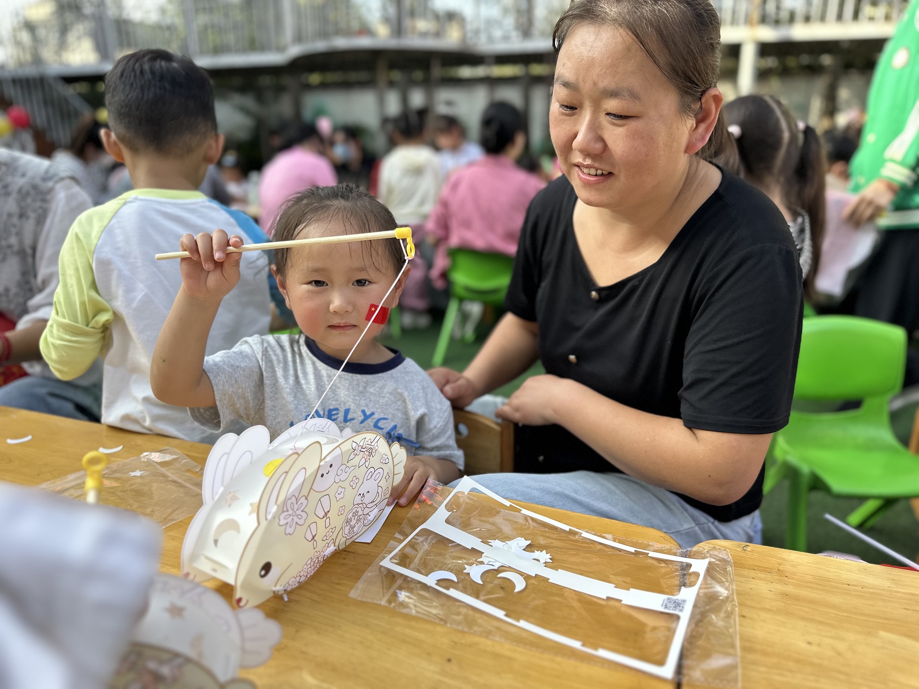 亲子灯笼制作现场暖意融融。在家长陪伴下,孩子们巧妙构思,将红色卡纸、彩绘图案、闪亮流苏组合成形态各异的灯笼。一盏盏灯笼不仅承载着中秋祈愿,更巧妙融入国庆元素——有的绘上五星红旗,有的以“航天”为主题,稚嫩的笔触描绘着对祖国的热爱。随后的“趣味灯谜会”更是点燃智慧火花,孩子们穿梭于灯笼间,争相竞猜,欢声笑语中,传统文化如春风化雨般浸润童心。