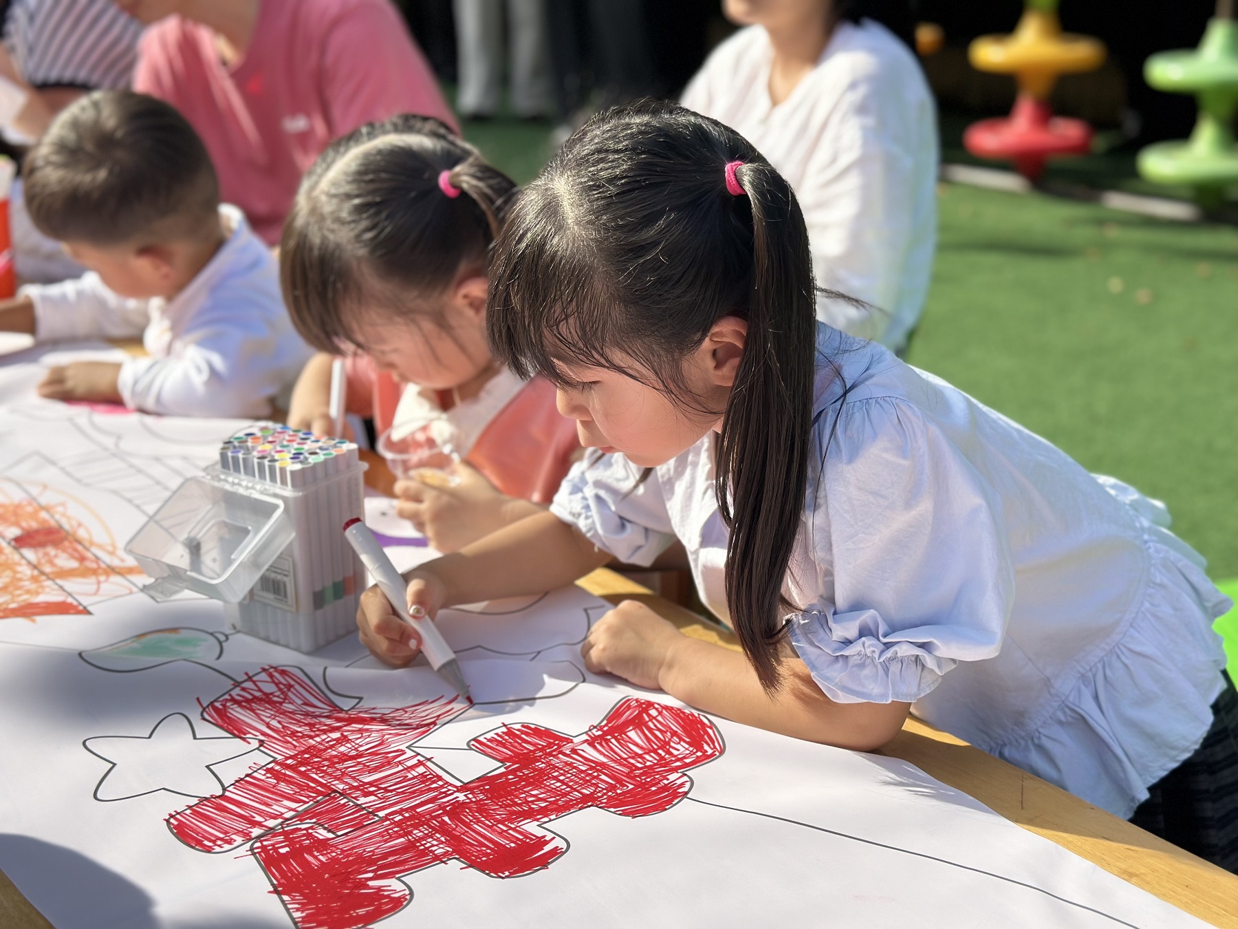 幼儿园精心布置了活动场地——绚丽的气球立柱、缤纷的灯笼谜语与主题展板交相辉映,营造出温馨团圆的氛围。在长卷绘画环节,孩子们手持画笔,在画卷上尽情挥洒创意。一面面鲜艳的国旗、一幅幅象征团圆的明月图景跃然纸上,他们用七彩颜料表达对祖国繁荣的祝福和对家庭安康的祈愿。