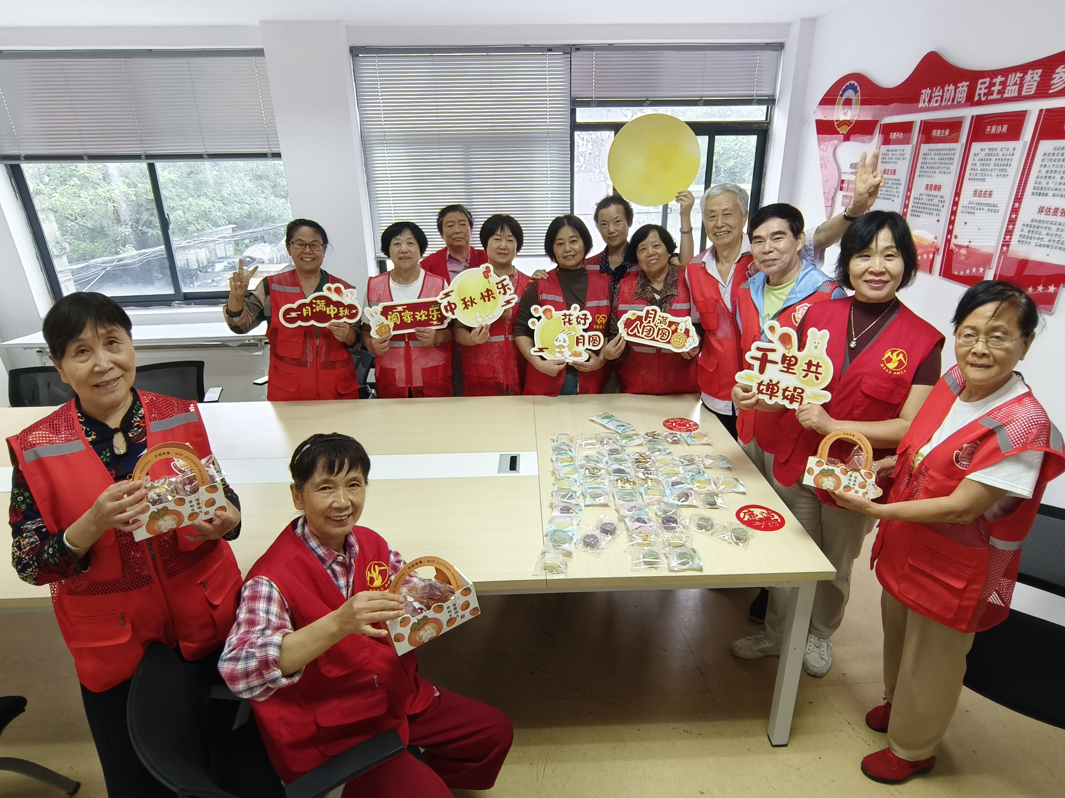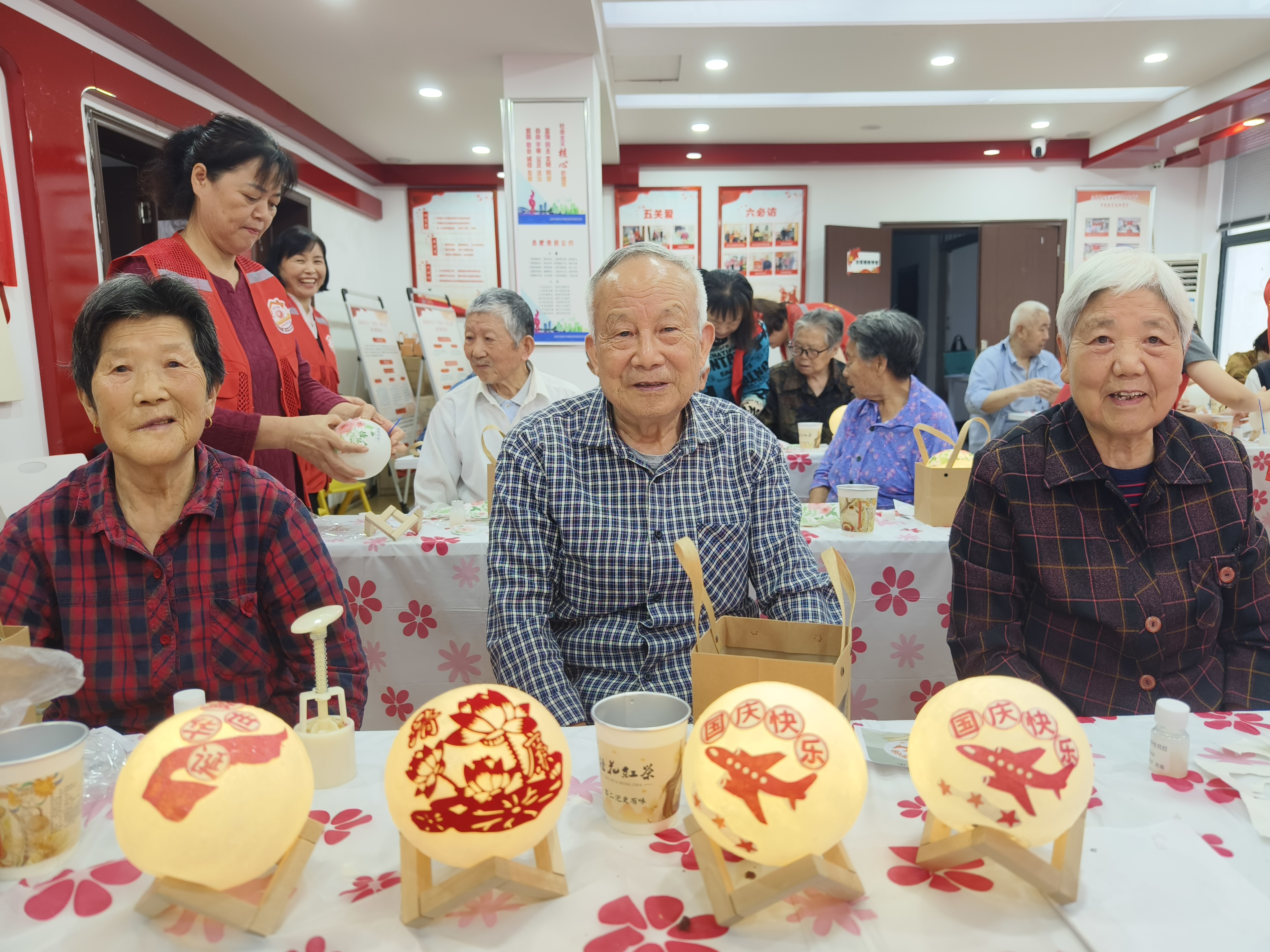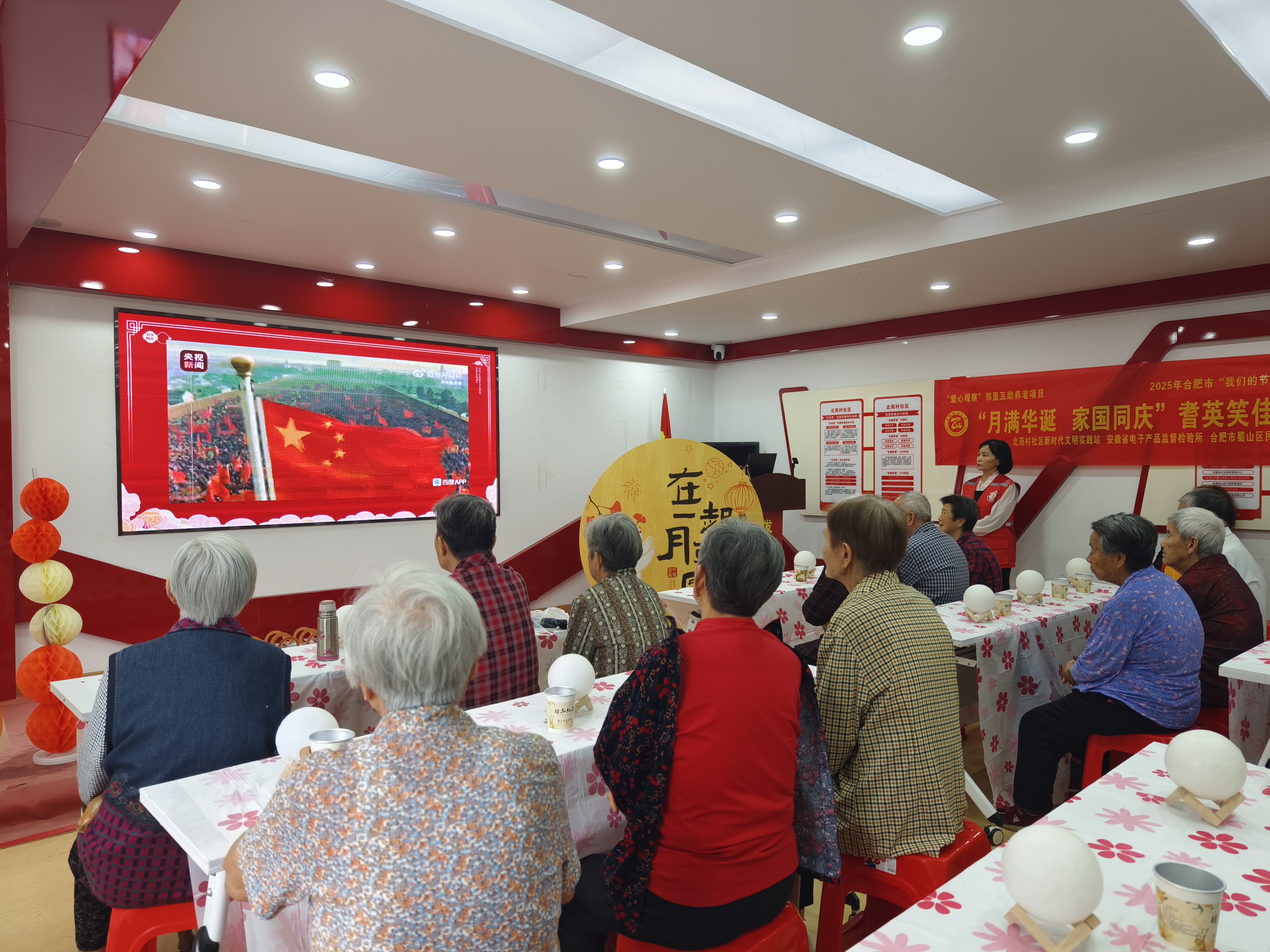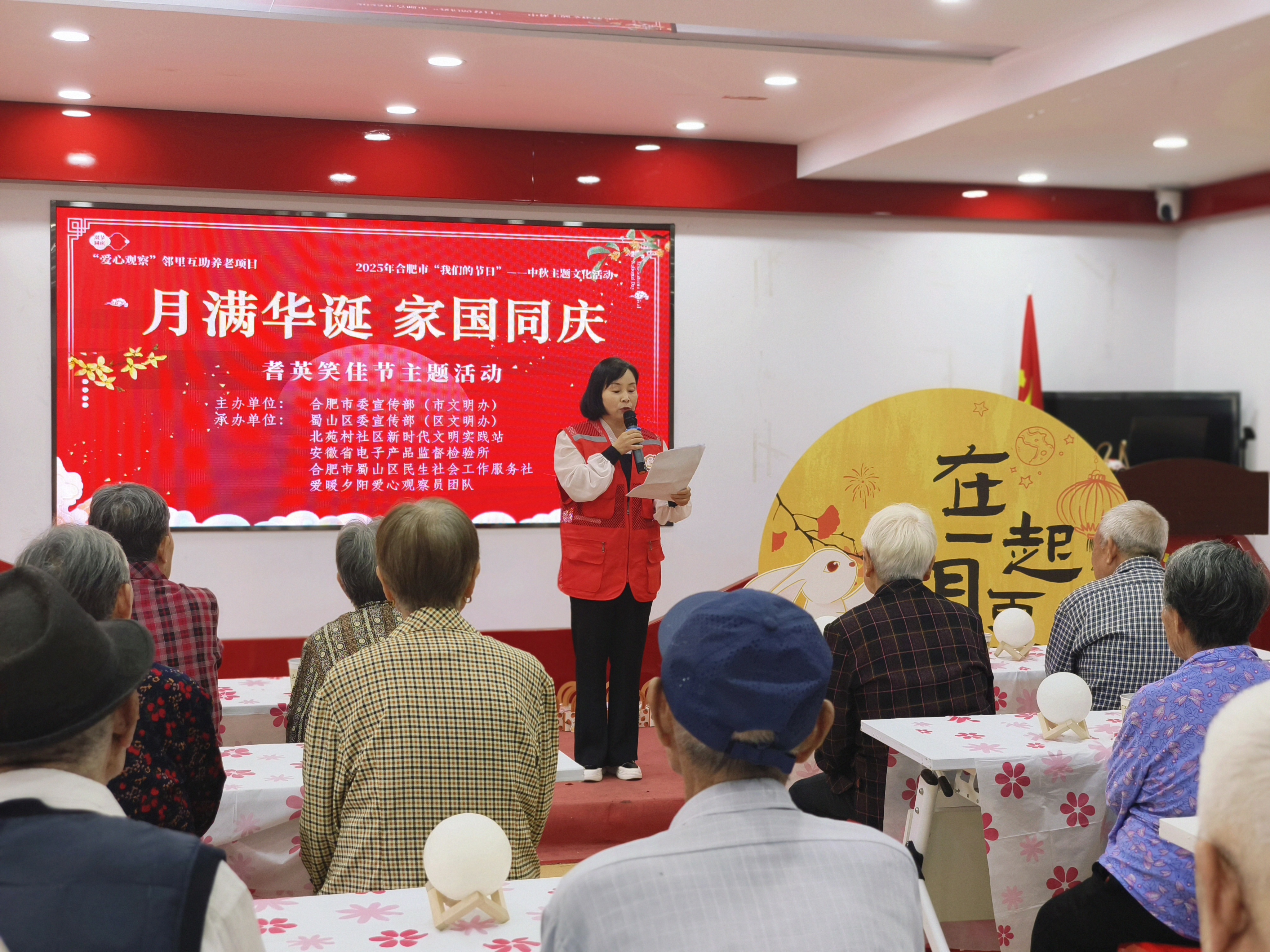 金秋送爽,丹桂飘香。9月29日下午,合肥市蜀山区琥珀街道北苑村社区依托“爱心观察”邻里互助养老项目,携手“红纽带”党建联盟单位安徽省电子产品监督检验所、合肥市蜀山区民生社会工作服务社及爱心探防队,共同举办“月满华诞,家国同庆”耆英笑佳节主题活动。活动现场,辖区内25位高龄失地农民与志愿者欢聚一堂,以丰富多彩的形式共庆家国团圆之喜。