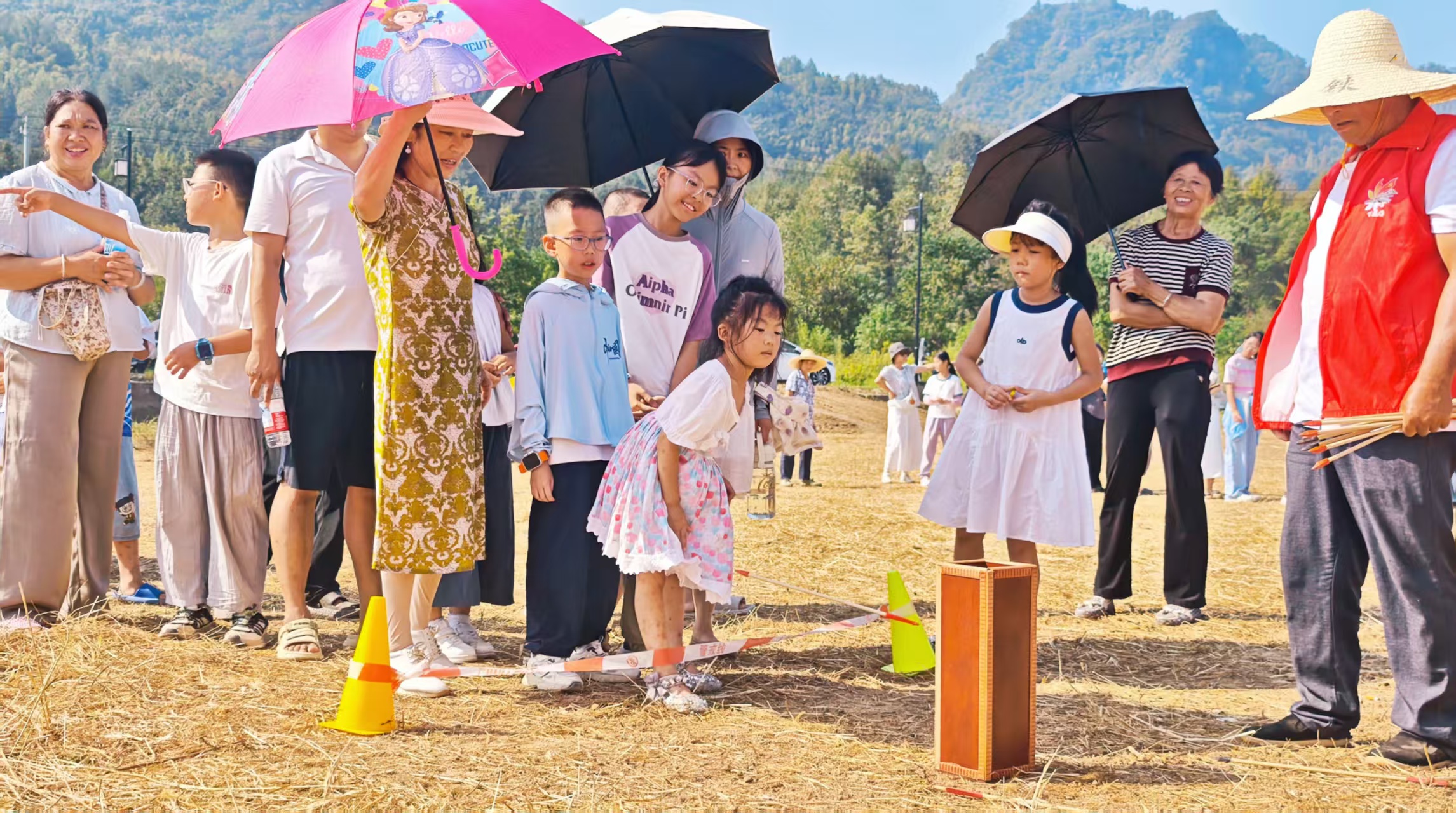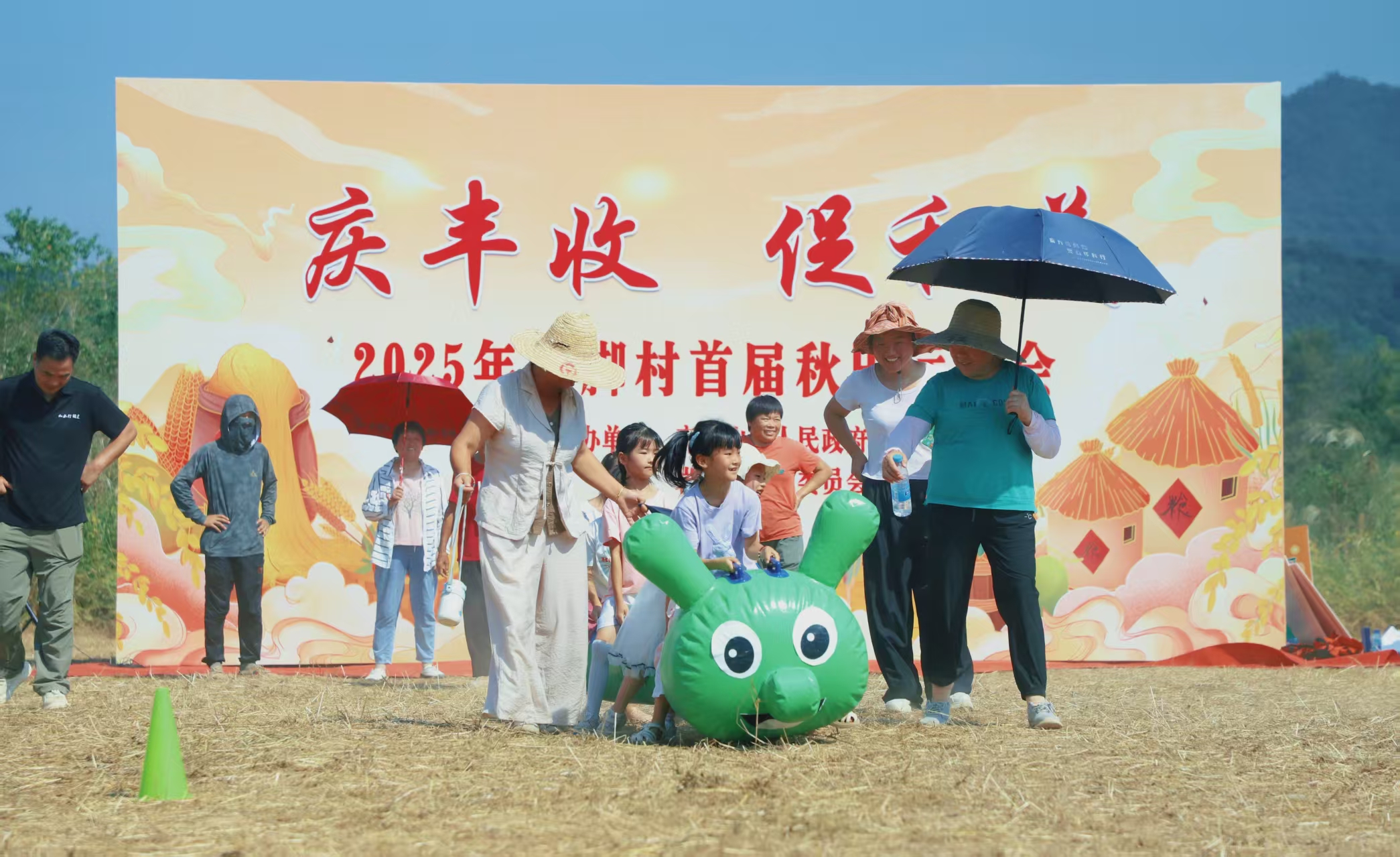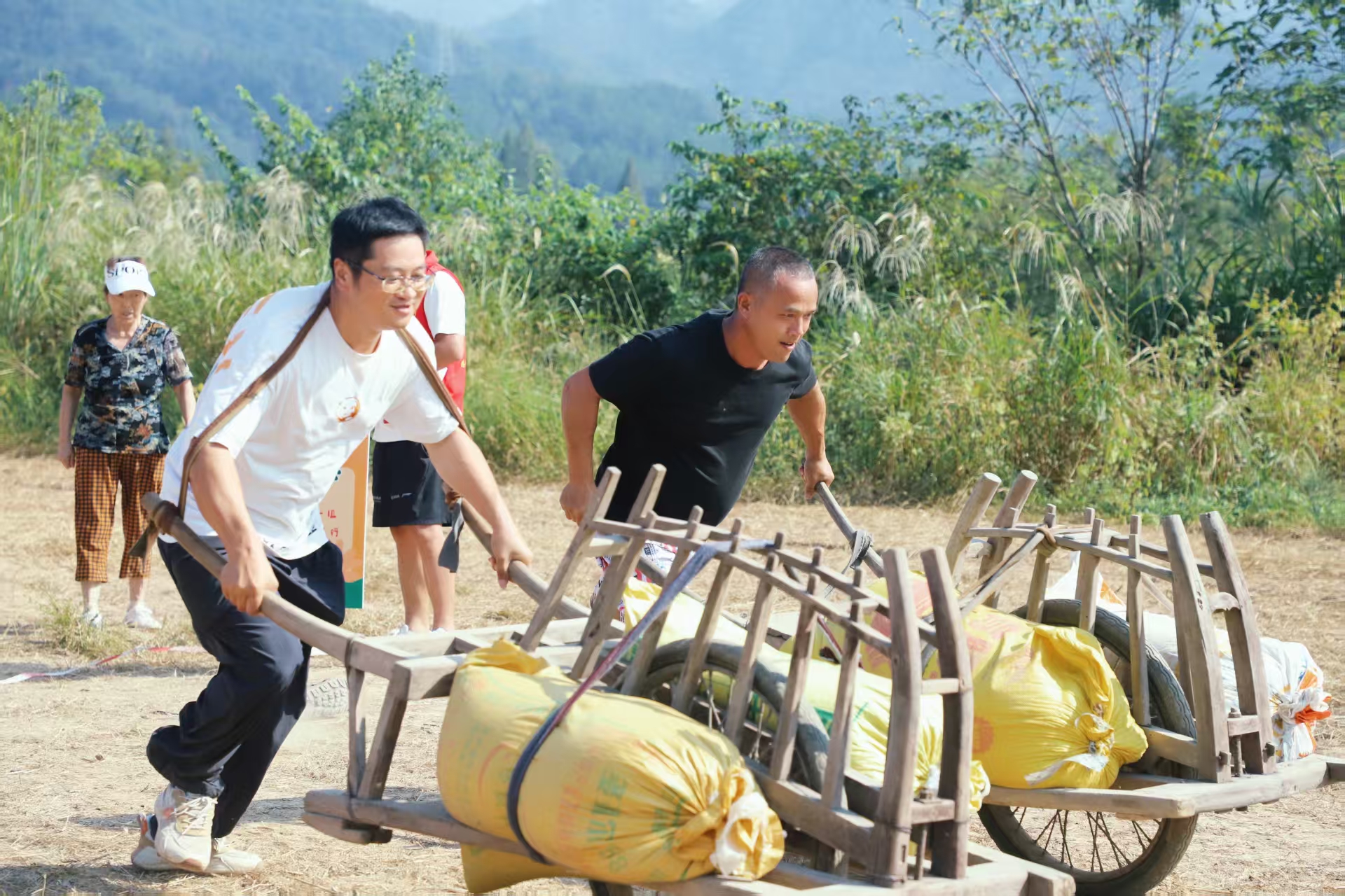 “加油!加油!”稻田里欢呼声、助威声此起彼伏,参赛选手们摩拳擦掌、跃跃欲试。拔河赛场上,选手们紧握绳索、脚蹬地面,身体后倾奋力拉扯;“赶鸡入笼”区域,选手们手持扇子小心翼翼煽动“小鸡”入笼;“推车运粮”趣味十足,村民们推着装满“果实”的独轮车你追我赶,在颠簸中考验着平衡与技巧……