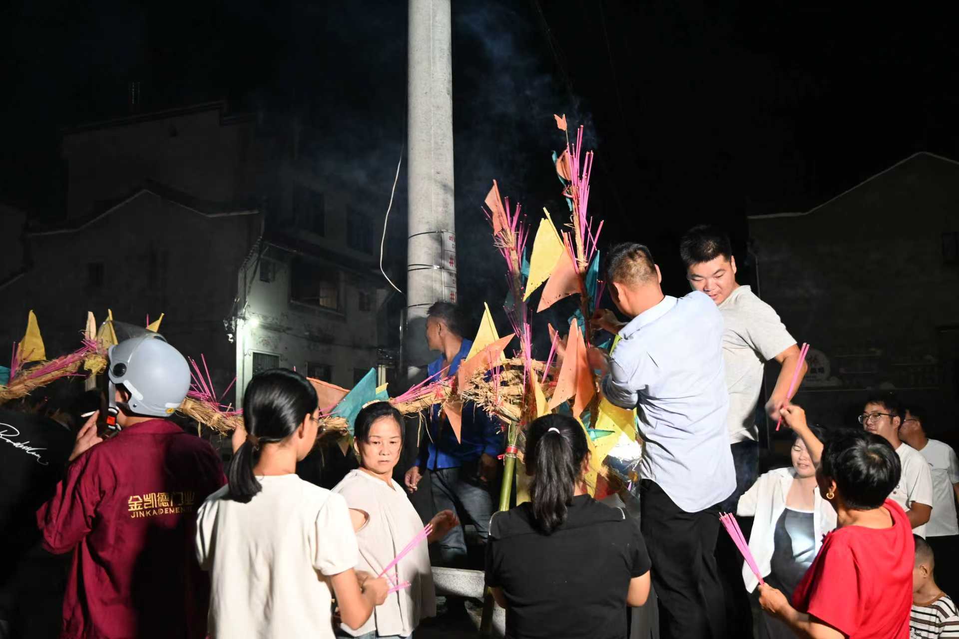 中秋舞龙是在古徽州地区长期活跃的民俗,有团圆、祈丰的寓意,香龙的龙身以稻草捆扎而成,蜿蜒数十米,象征“龙脉绵延”,村民们共同参与香龙的“点睛”与“插香”,每一炷香由村民亲手插上,寓意“人人出力,共祈平安”,所以香龙又被称为草龙、香火龙或者火龙,并且在夜间起舞,舞龙时要做到举龙要稳、转身要快,龙才有神,配合上锣鼓声和鞭炮声,让寂静乡村一时闹腾,巡游结束之后,常以“送龙下水”收尾,寓意祛灾纳福、来年风调雨顺、五谷丰登。(谷庆江 汪士奇 杨艳玲)