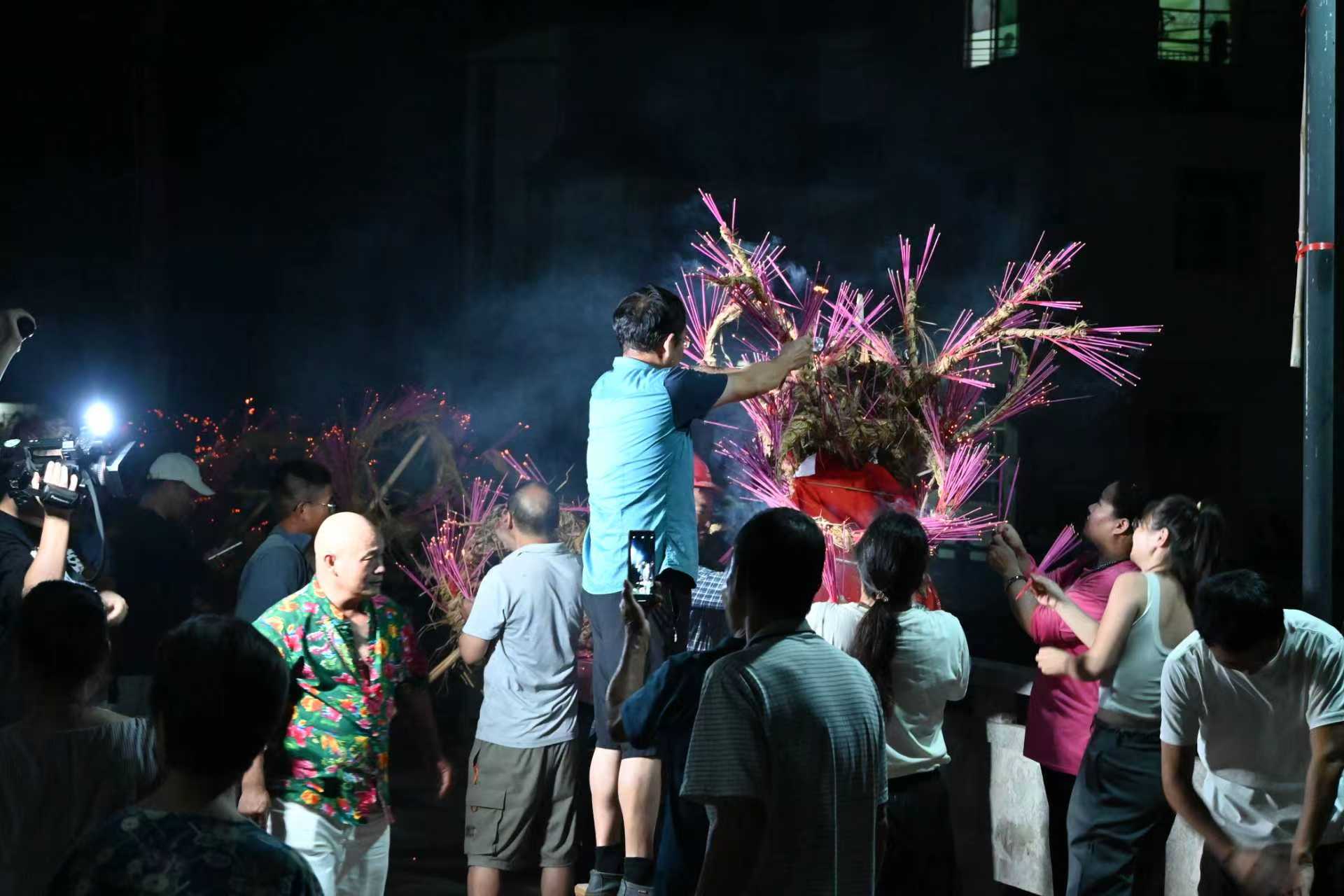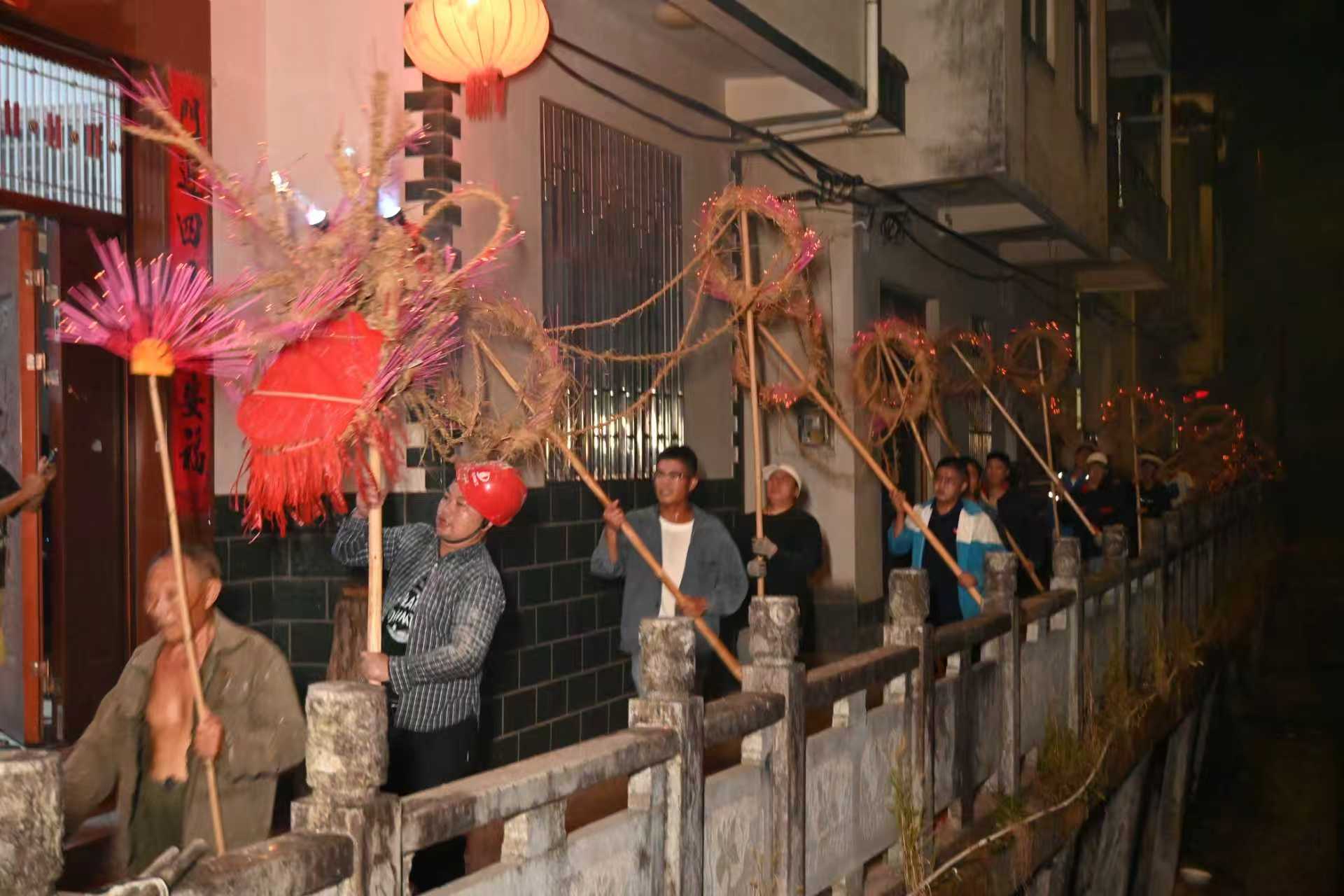 在龙田乡浯田村,中秋夜晚,一条由66名中青年舞动全长约169米的香龙,自村头至村尾穿行巡游,在锣鼓铿锵、烟花鞭炮声中,沿线的村民燃放鞭炮迎接,人潮涌动、灯火辉映,满目“火龙腾跃、月华如水”的节日图景。在璜尖乡璜尖村,村民们手持插满香火的稻草龙,伴随铿锵的锣鼓声穿行于村巷之间,以这一古老仪式表达对来年的美好祝愿,也让这项承袭数百年的民间传统习俗在当代生活中焕发出崭新活力。