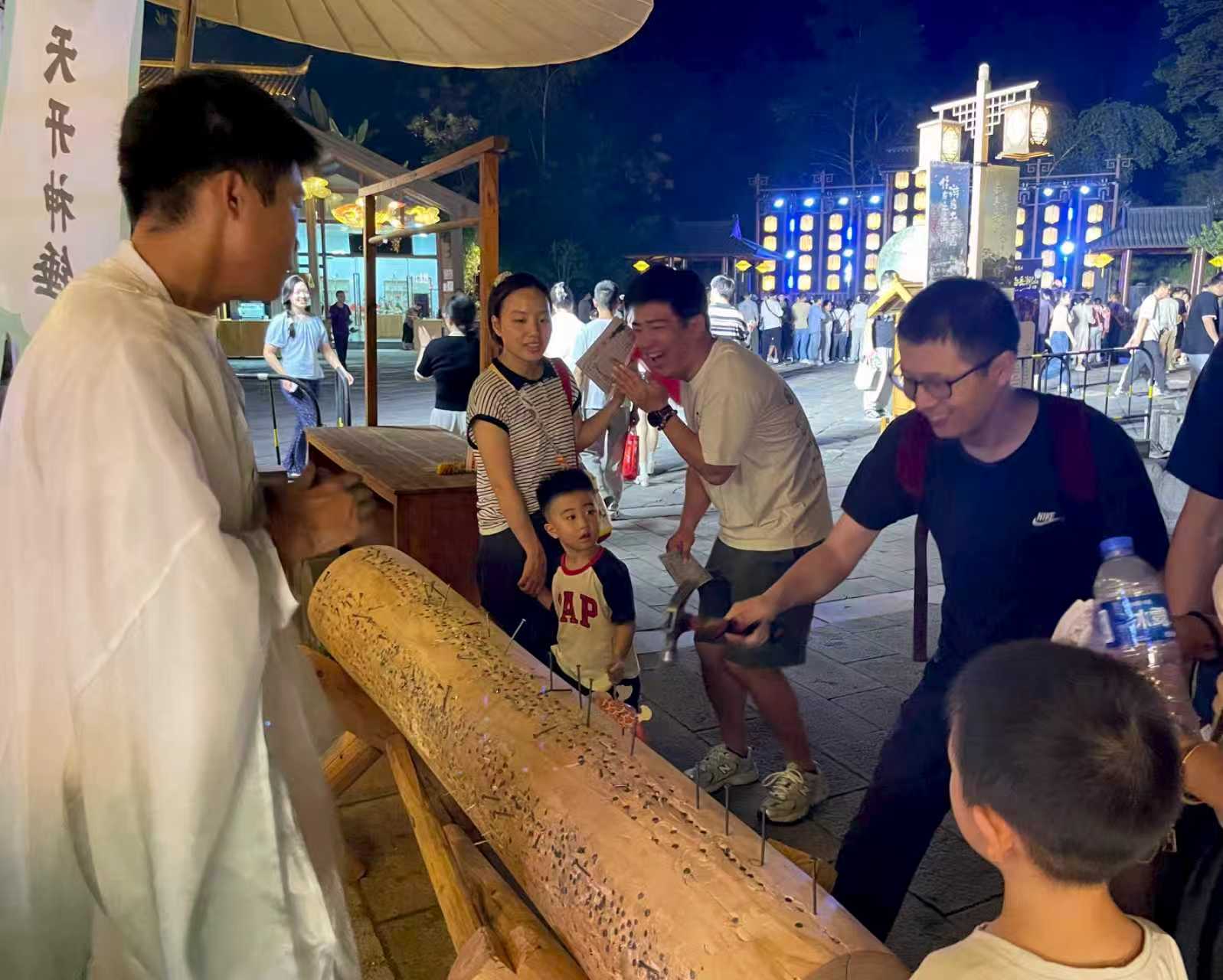 下午,游客汇聚于山下逍遥街,参与全场景互动式逍遥货币体验项目,全身心沉浸于浓厚的市井氛围之中。50余项演绎超百场活动精彩纷呈,仙、侠、隐、士四大主题角色齐聚街区,游客可参与互动,体验特色文化,并通过投名状、太极云手、字里乾坤、天开神锤等互动项目获取逍遥通宝。此外,游客可凭6张逍遥通宝兑换抽奖券,在每晚“财神赐财”抽奖环节参与现场抽奖,赢取现金及运动相机、蓝牙耳机等礼品。