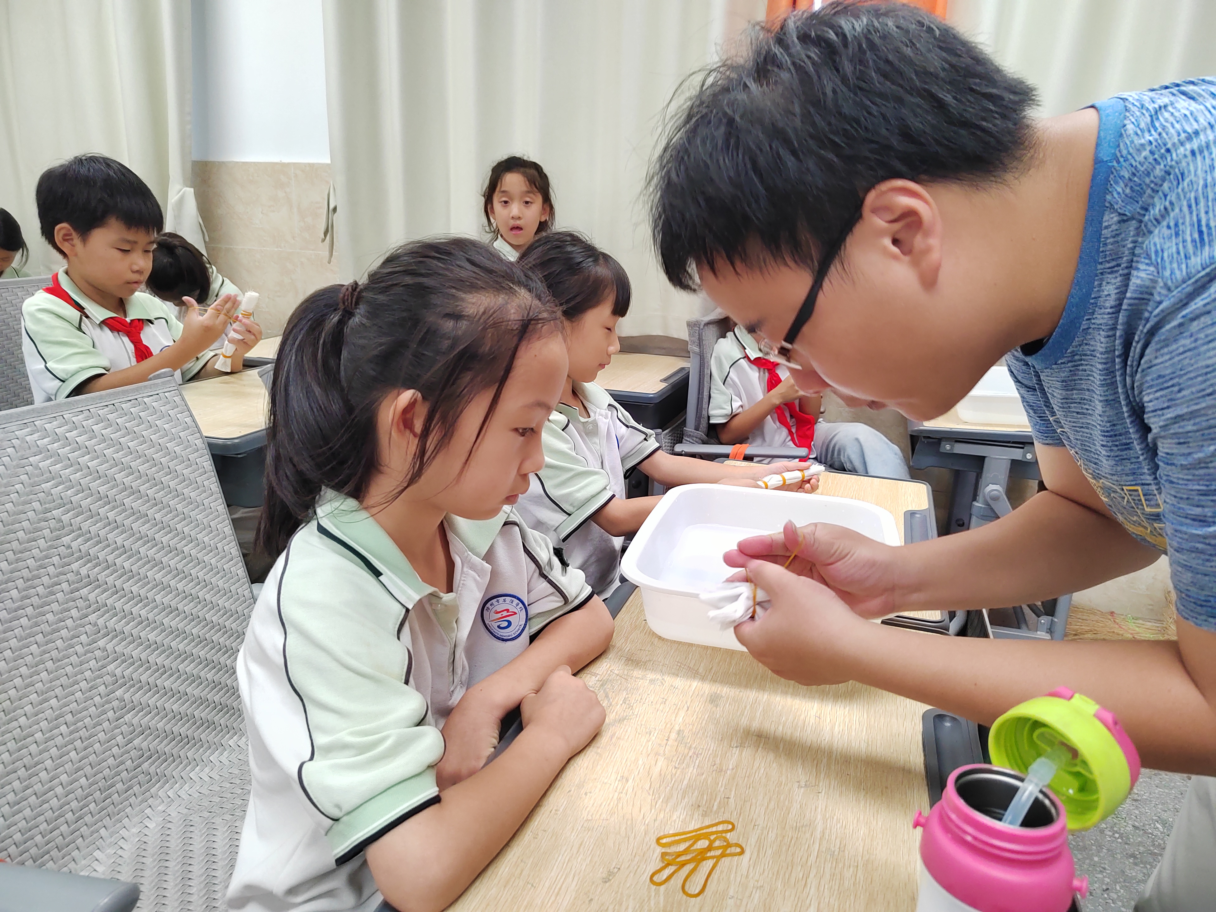 活动伊始,老师以故事为引,用生动的语言为孩子们讲述了扎染从古代走向今天的故事,展示了一件件蓝白相间的精美作品。在技法演示环节,老师手把手示范了“彩条扎法”和“花朵扎法”,看似普通的橡皮筋和白布,经折叠、绑扎、浸染、冲洗等步骤后,竟绽放出独一无二的纹理。“要扎紧一点,颜色才会漂亮!”在书苑工作人员的协助下,孩子们小心翼翼地摆弄着手中的方巾,有的扎出整齐的条纹,有的尝试不规则的褶皱,还有的大胆搭配色彩,教室里满是专注与欢笑。