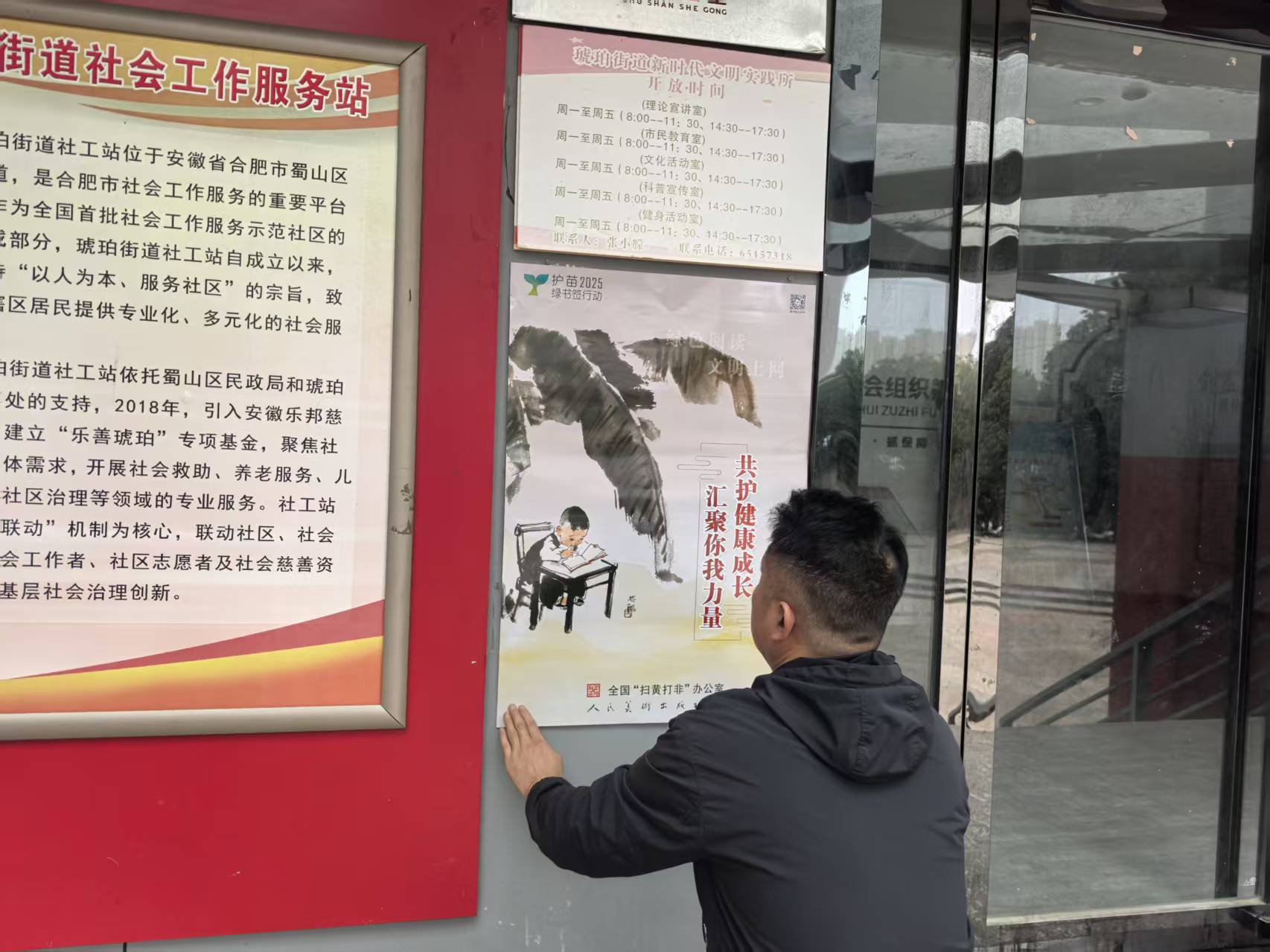 10月15日,为护助少年儿童健康成长,抵制有害出版物和信息,营造绿色、健康的社会文化环境,合肥市蜀山区琥珀街道奥林花园社区启动“护苗2025·绿书签”专项行动。一幅幅设计醒目、主题鲜明的宣传海报在社区宣传栏、楼道入口、社区活动中心等位置张贴起来,如同一颗颗“绿色种子”,在社区播撒下文明、健康的希望。