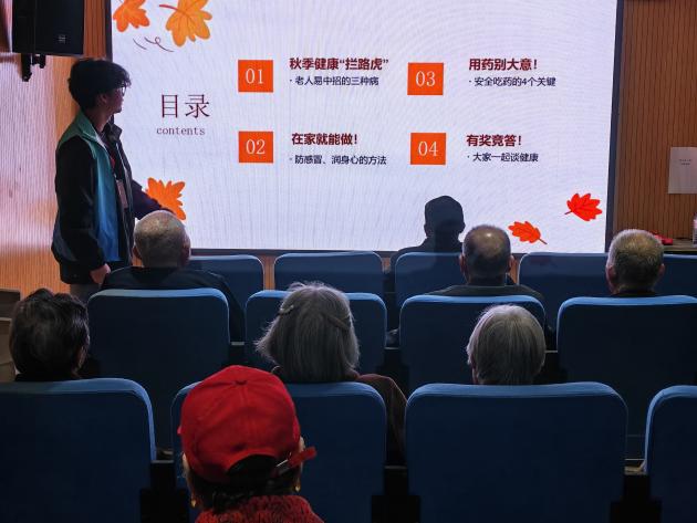 活动中,志愿者通过视频播放与PPT讲解相结合的方式,为社区老人系统介绍了秋季常见疾病的预防知识,重点讲解了呼吸道感染、心脑血管疾病等秋季高发疾病的防护要点。同时,结合老年人常见慢性病情况,志愿者还就安全用药、合理膳食、适度运动等方面进行了现场指导和答疑,帮助老人们增强自我保健能力,树立健康生活理念。