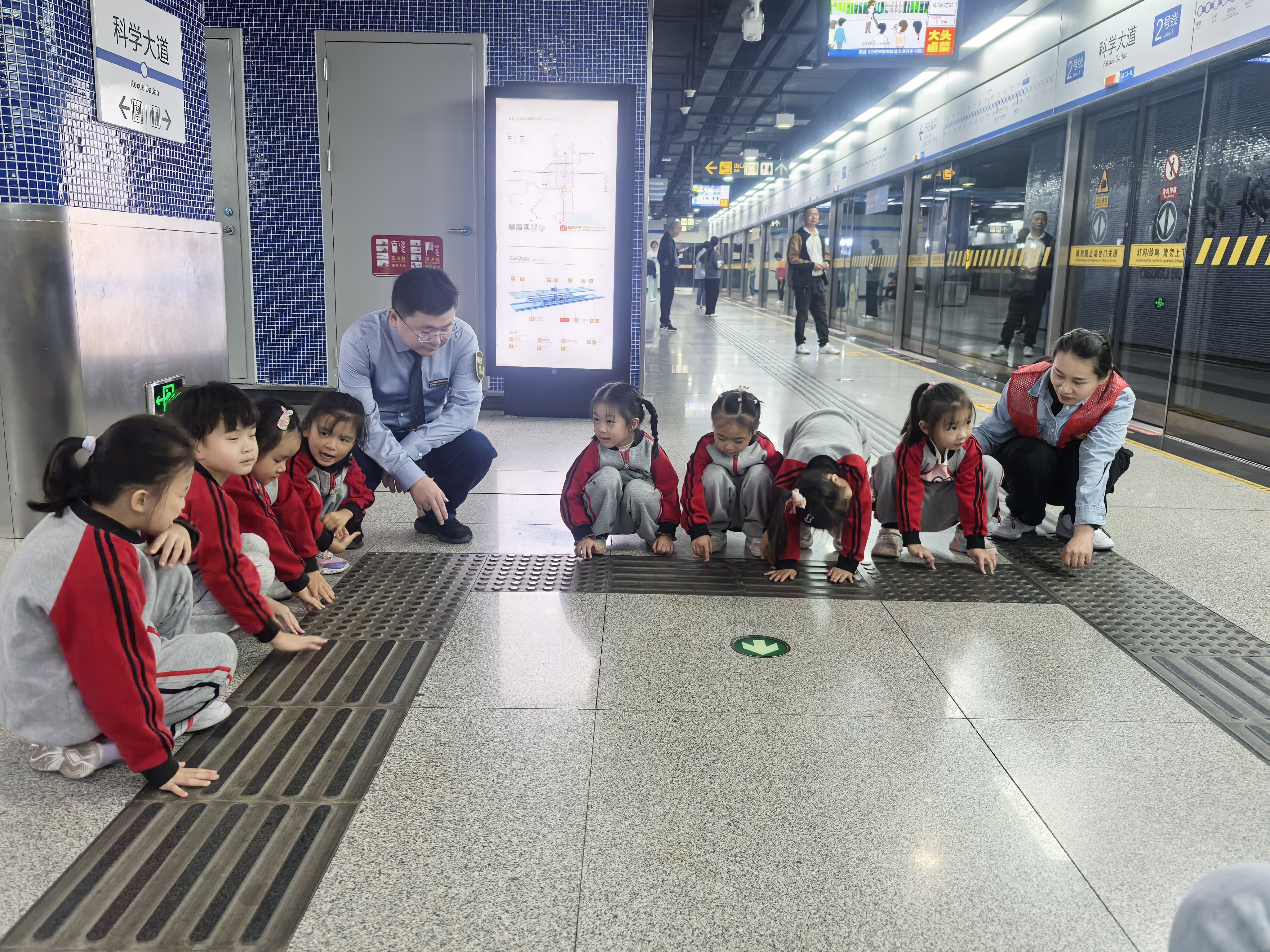在无障碍设施体验环节,孩子们学习了地铁站为盲人、老人和行动不便的乘客设置的各种设施,如盲道、无障碍电梯和轮椅坡道等。孩子们在志愿者的鼓励下积极实操,进一步加深了对公共服务设施的理解,也在心中播下了关爱他人、服务社会的红色种子。