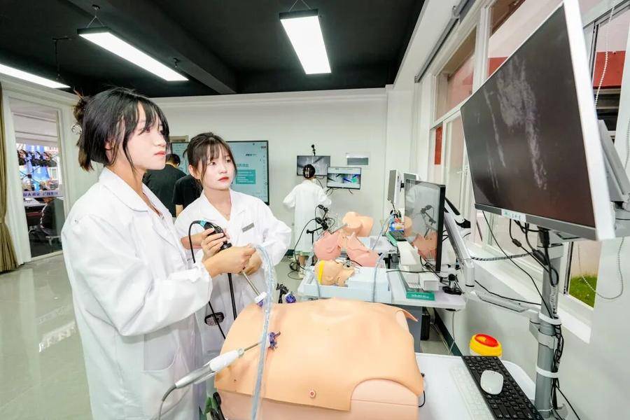 医学生在融合AI技术的医疗设备进行模拟训练。
