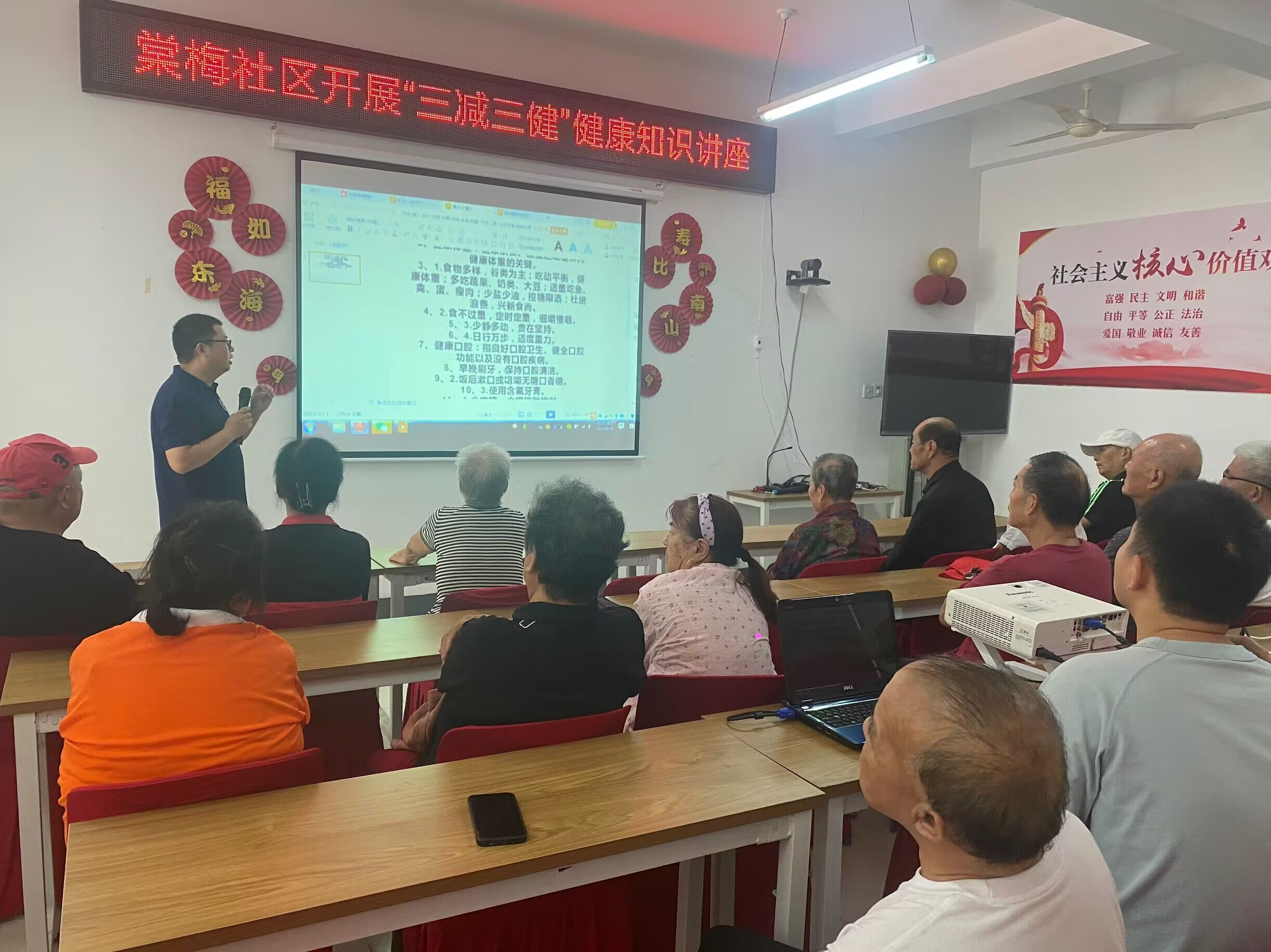 近日,棠梅社区党委连同棠梅社区公共卫生委员会开展“三减三健”知识讲座,宣讲冬季健康知识,邀请辖区15名居民前来参加,旨在提高辖区内老人的疾病预防意识,为即将到来的冬天做好冬季防护工作。