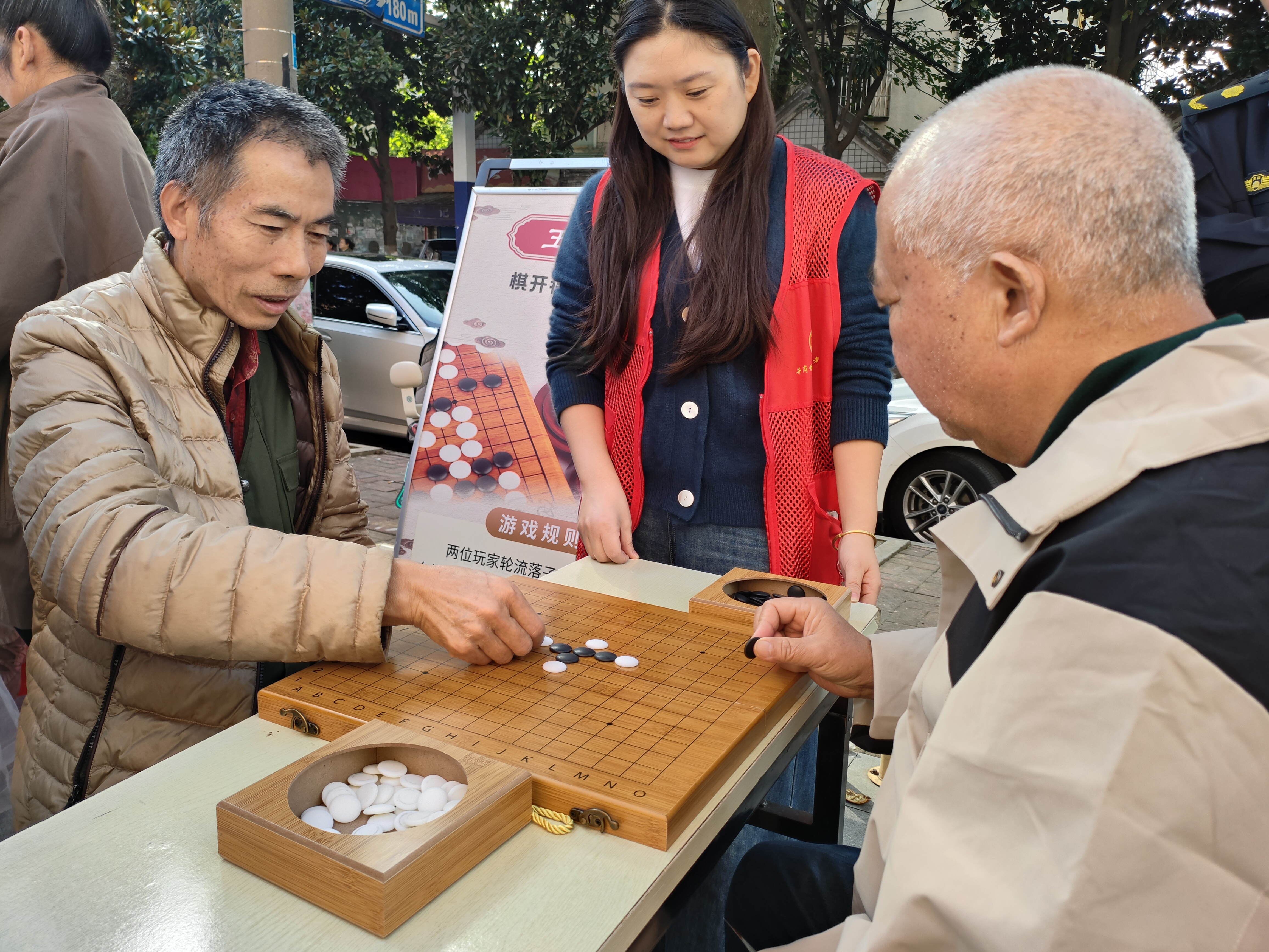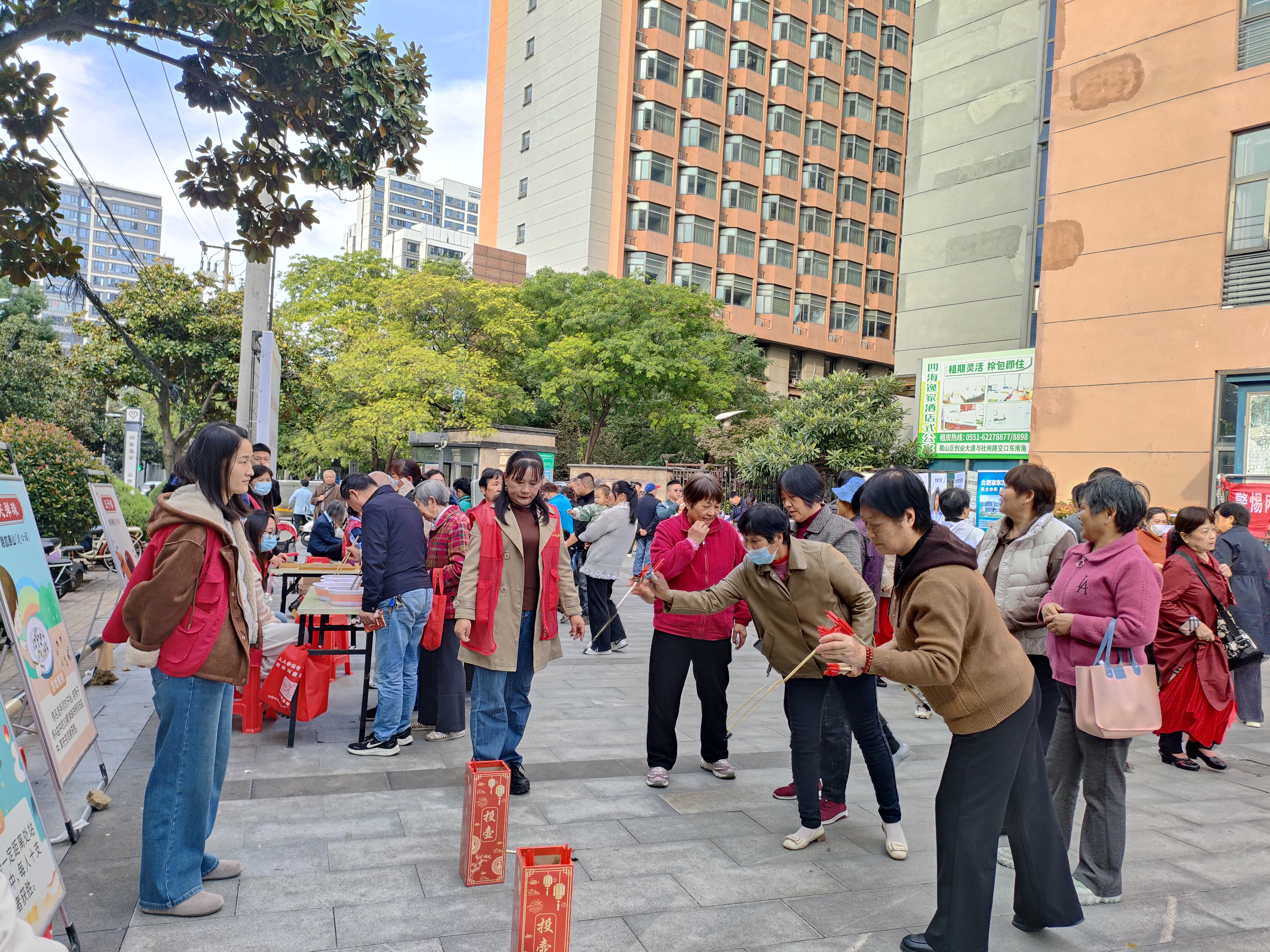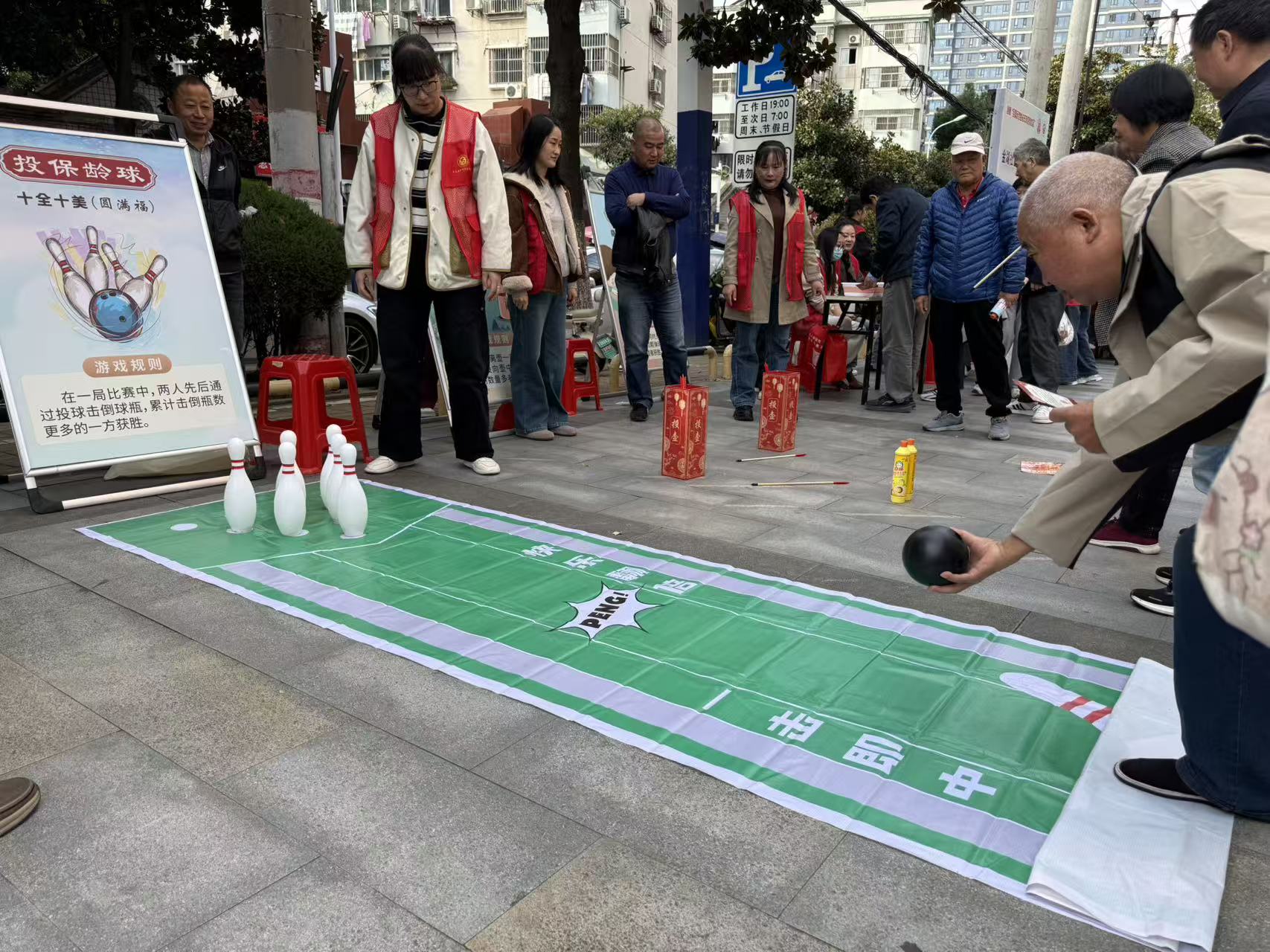 与此同时,广场另一侧的“老年趣味运动会”也如火如荼地进行。夹弹珠、打陀螺等经典游戏唤起了老人们童年的记忆。在夹弹珠摊位前,老人们屏息凝神,手持筷子专注地夹起光滑的弹珠,周围不时传来“稳住!”“好样的!”的鼓励声。打陀螺区域更是热闹非凡,鞭声清脆,陀螺飞旋,几位大爷手法娴熟,神情专注,仿佛重回少年时光。老人们手持“集福卡”,或与老伴携手,或与邻里结伴一同参与,活动现场洋溢着浓浓的亲情与友情。