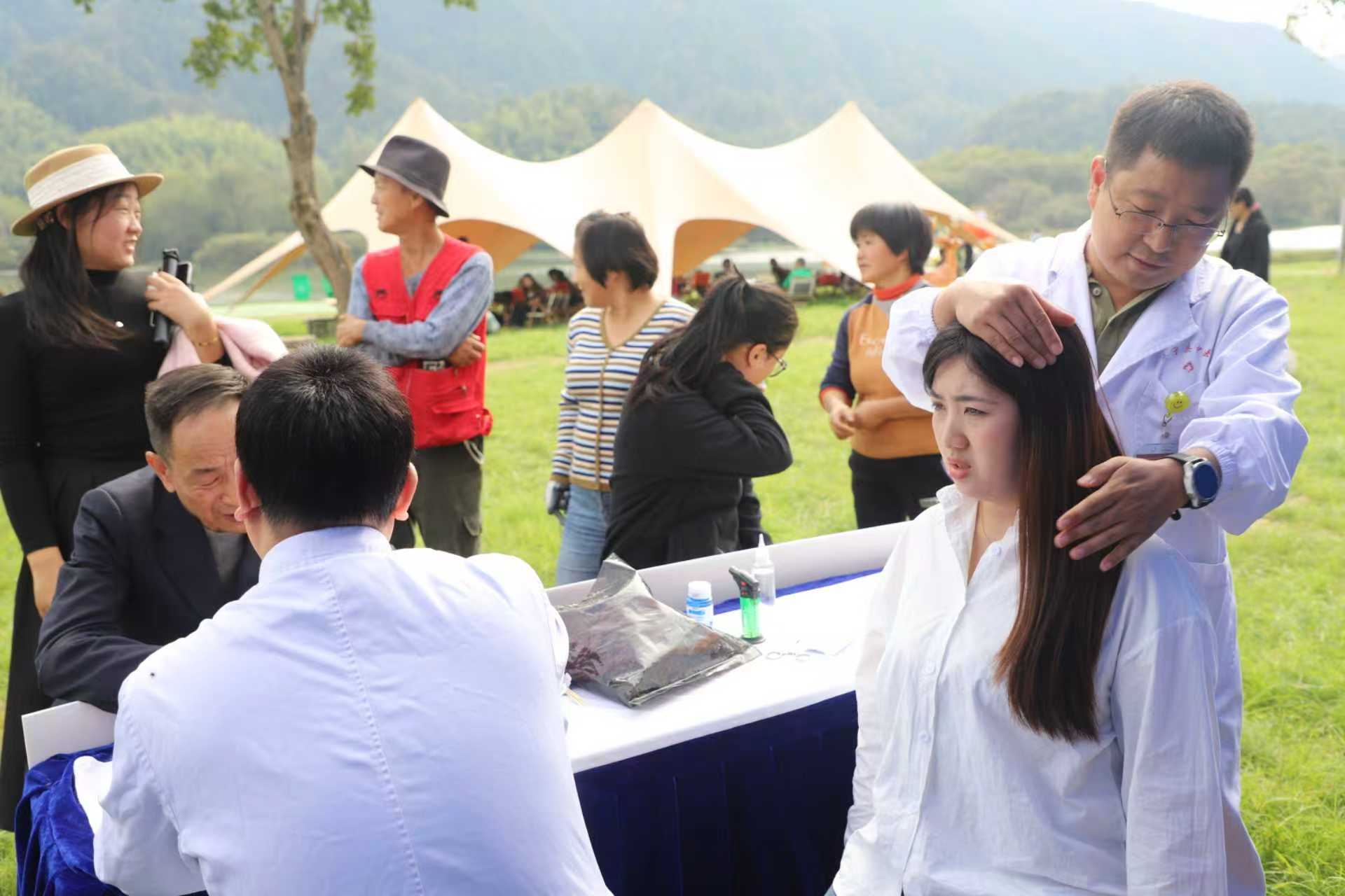 舞台之外,乡村市集人气旺盛,烟火气十足。非遗展示区内,五城茶干、米酒等传统美食制作技艺引人驻足,游客不仅能现场体验制作,也能品尝地道风味;特色农产品展销区则汇集了本地20余种美食好物,方便游客在观赏演出、品尝美食之余选购心仪特产;新安中医药集市区域挤满当代“脆皮”养生人群,有参加义诊的、有品尝茶饮的……