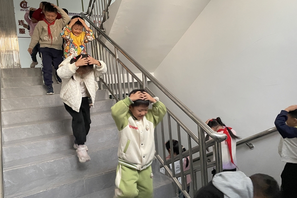 随着尖锐的模拟地震警报响起,演练正式开始。小朋友们立刻双手抱头、弯腰屈膝躲到课桌下,紧贴桌腿保护自己,避险动作规范有序。待“强震”稍缓,在工作人员引导下,他们保持“低姿弯腰、双手护头”姿势,沿墙壁快速通过走廊,不推挤、不慌张,有序撤离至小区空旷应急集合点,全程仅用时2分40秒。