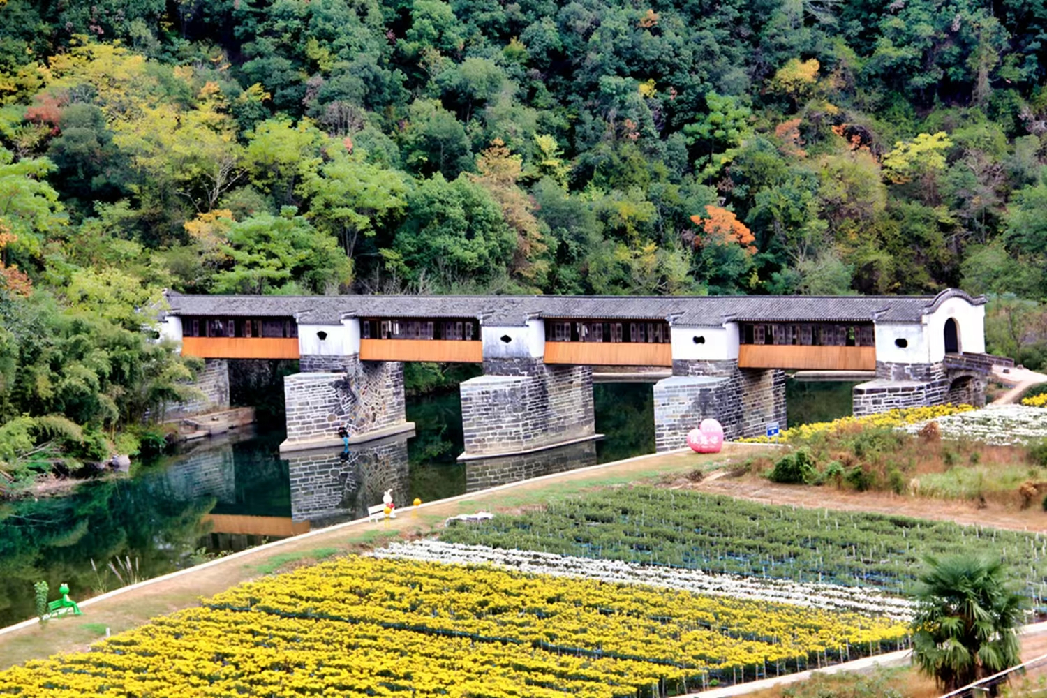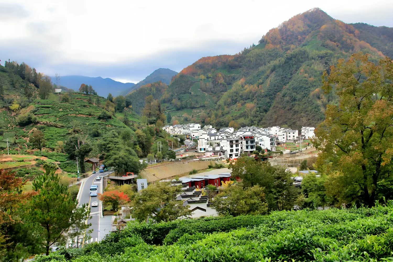 近日,休宁县G205国道屯黄公路和S476省道沿线层林尽染,漫山树木五彩斑斓,田野里一片片金黄色、雪白的菊花,与一个个白墙黛瓦的村庄相映成趣,构成了一幅幅美丽画卷。(黄山市公路中心休宁分中心 曹集林 李春霞)