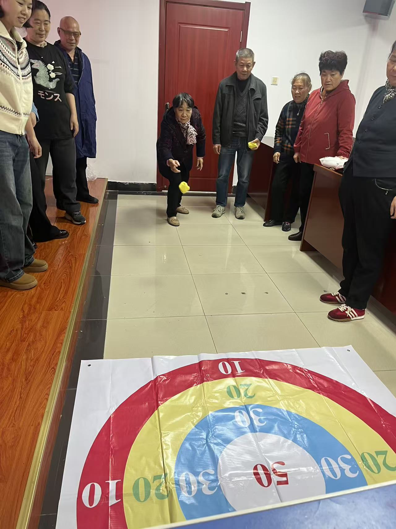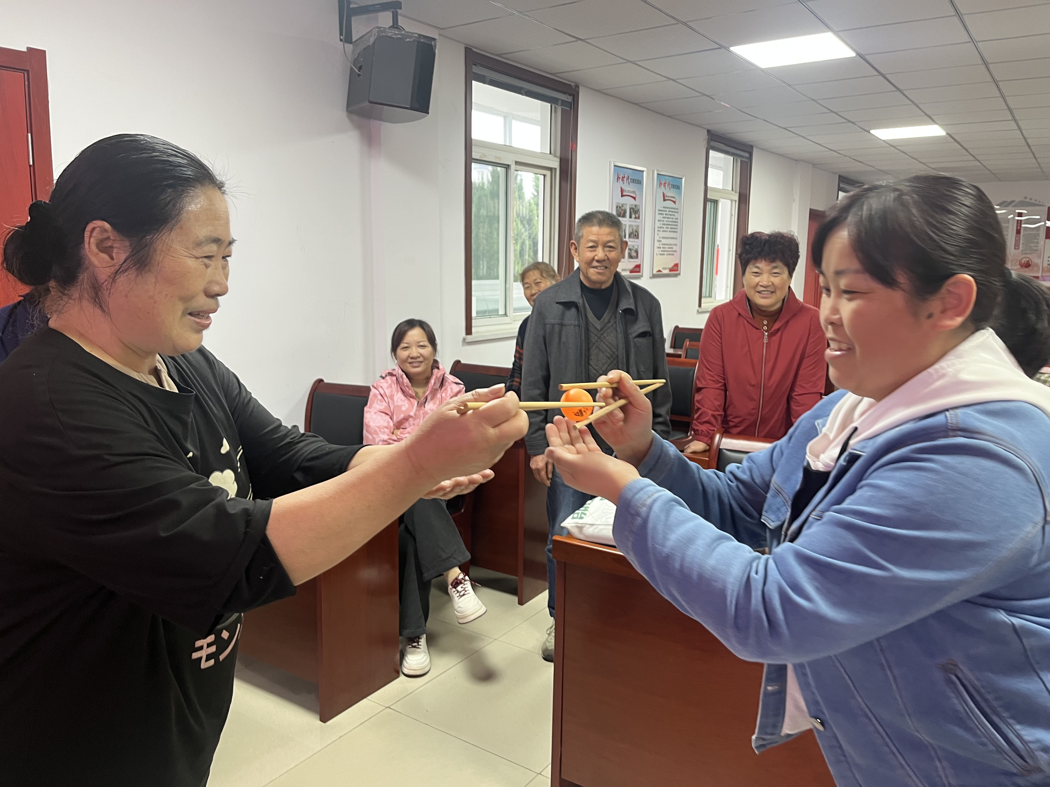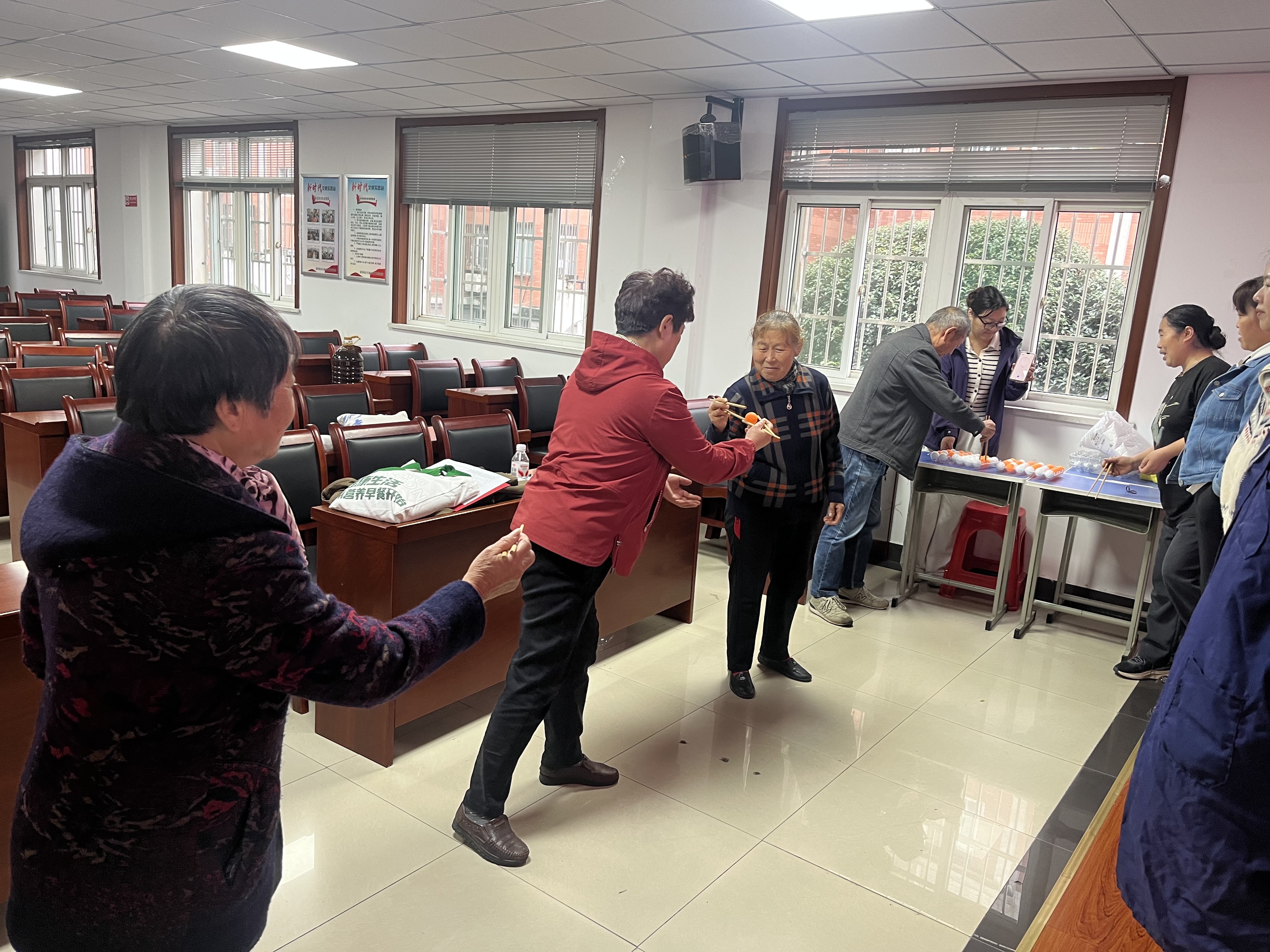 表彰环节结束后,现场瞬间转变为欢乐的海洋。趣味团建活动在主持人的号令下正式开始。志愿者们通过随机分组,以团队形式参与了三个精心设计的趣味游戏。在“乒乓球五子棋” 赛场,队员们化身为“棋手”,紧盯由鸡蛋托拼成的“巨型棋盘”,小心翼翼地将彩色乒乓球放入凹槽,既要谋划自己的“五子连珠”,又要阻断对手的攻势,策略与趣味并存,现场充满了欢声笑语。“沙包投掷” 区域则充满了童年的回忆。志愿者们屏息凝神,瞄准分值靶盘奋力一投,每当有高分产生,便引来队友们的欢呼与喝彩。简单的游戏,让大家重拾童趣,气氛热烈非凡。最考验耐心与协作的当属 “筷子夹乒乓球”接力。队员们需要用长筷子夹住光滑的乒乓球,并依次传递给下一位队友,最终运送到终点的篮子里。现场既有稳稳传递的成功喜悦,也有乒乓球不慎滑落的紧张与欢笑,充分展现了团队成员间的默契与互助。