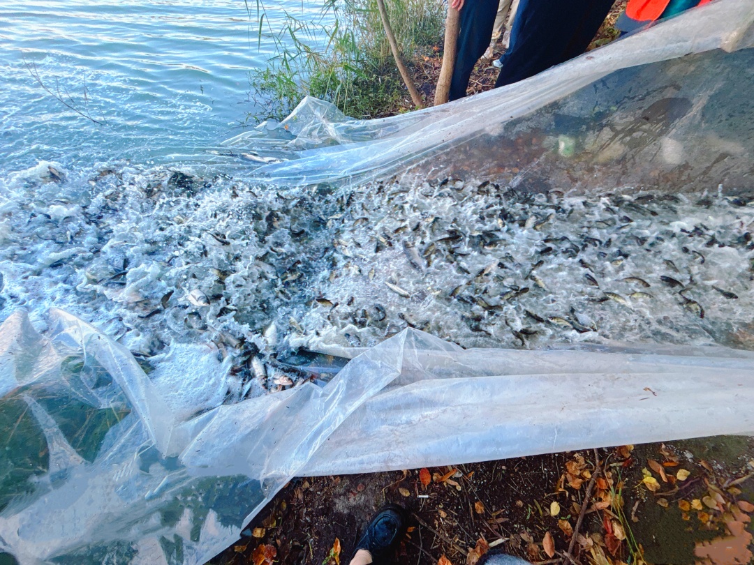 11月15日下午,在合肥市翡翠湖,该区应急城管局、公用事业公司工作人员将一尾尾鱼苗通过塑料薄膜做成的水道缓缓放入水中,鱼儿们欢快地向湖中游去。景区管理处负责人介绍,根据安徽省农科院专家的指导,本次投放的鱼苗主要是我国传统“四大家鱼”,一共2500斤的鲢鱼、鳙鱼和草鱼等滤食性鱼类,将在翡翠湖风景区安家落户。“本次是第一批投放,后期还要投放。”她说道。
