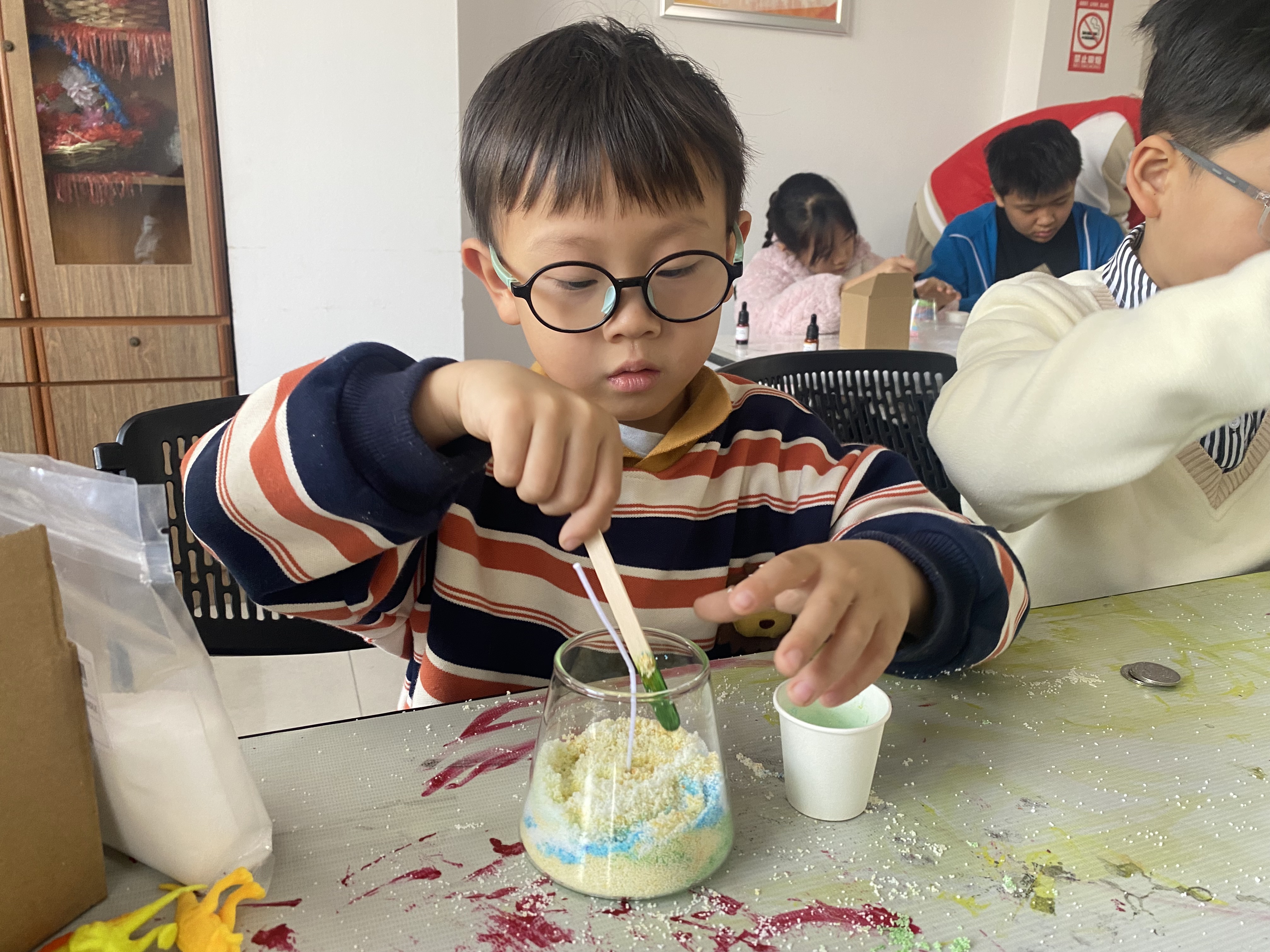 创作环节中,孩子们化身“小小设计师”,充分发挥天马行空的想象力。有的小朋友用蓝白沙粒勾勒出“海底世界”,点缀贝壳装饰,滴入清新的海盐香薰;有的搭配粉紫渐变沙色,粘贴小雏菊干花,融入温柔的薰衣草香;还有的大胆尝试撞色搭配,用亮片点缀出“星空”模样,搭配甜甜的柑橘香调。志愿者老师巡回指导,耐心解答孩子们的疑问,协助他们解决创作中遇到的小难题,现场欢声笑语不断。