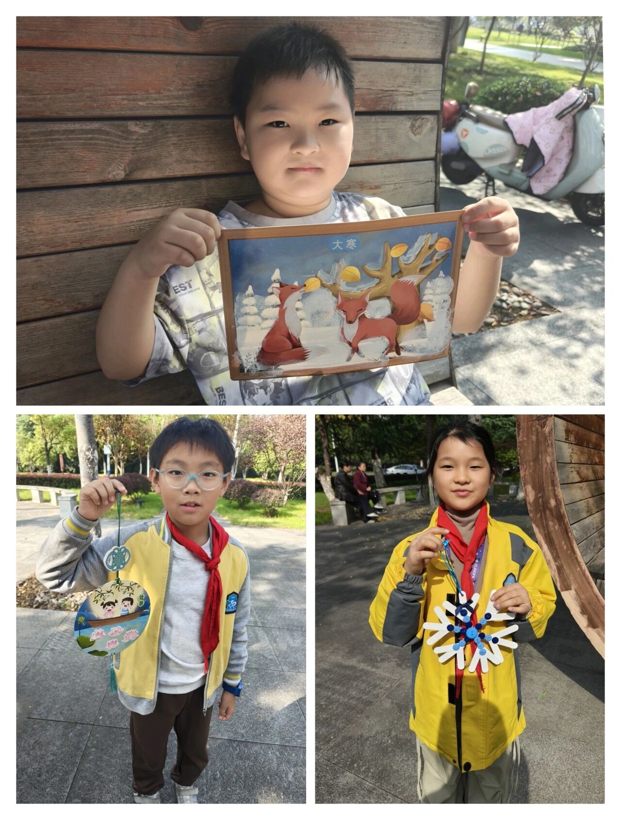 活动伊始,小队员们琅琅诵出《二十四节气歌》并能准确说出对应的节气名称。当被问到“关于二十四节气,你还知道什么?”的时候,孩子们纷纷举手发言,有的说立春吃春饼,有的说冬至吃饺子,有的说清明要祭祖,还有的说芒种不种,再种无用......随后,家长带着小队员们了解和学习了更多关于二十四节气的相关知识。接着,活动进入“指尖上的二十四节气”——做手工环节。小队员们各选择一个自己喜欢的节气图片,时而裁剪、时而粘贴、时而涂画......认真专注又充满期待。不一会儿,一幅幅精美的作品就逐渐完成了。