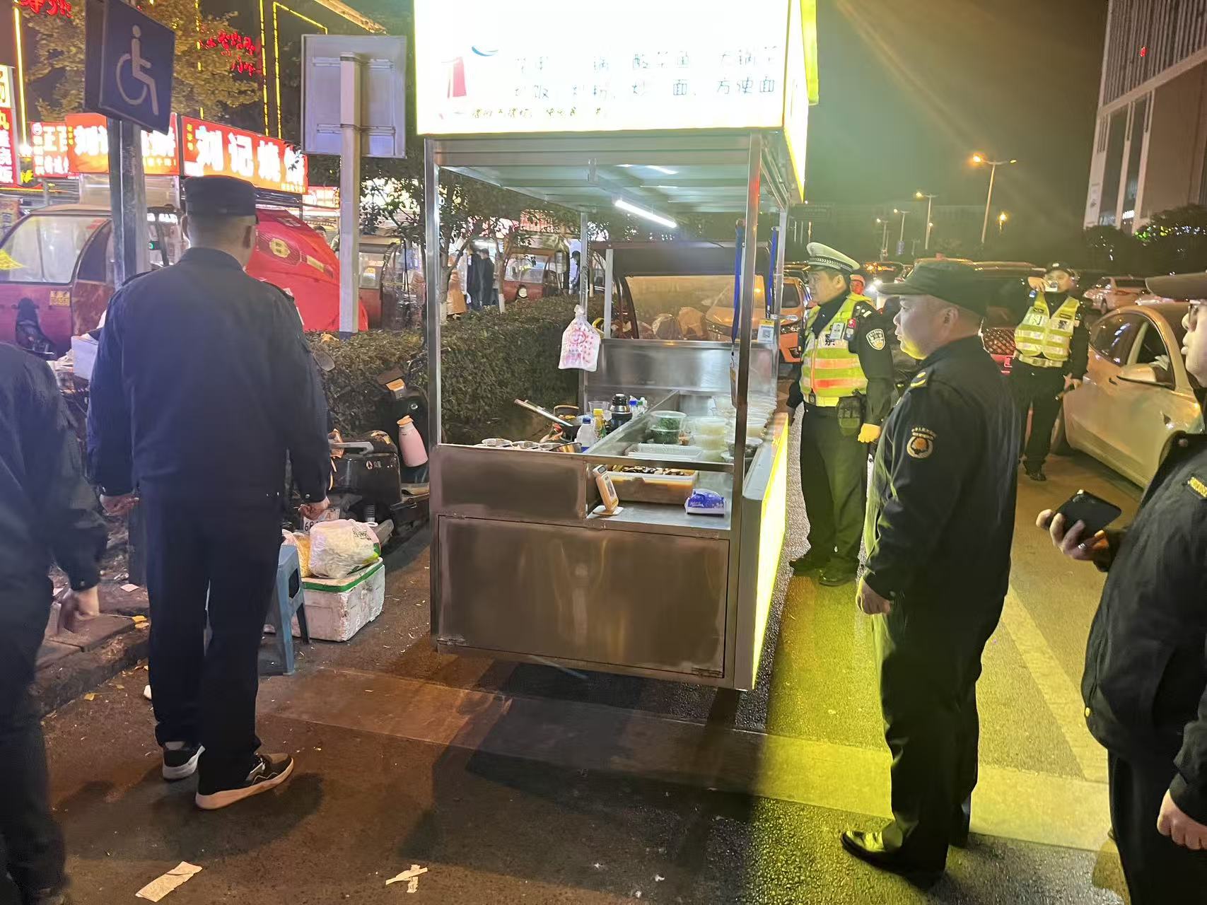 此次行动区执法小组牵头,联合市城管局、交警、公安、市监等多部门,以田埠东路与蜀峰路交口、稻香路与蜀峰路交口、雪霁路与田埠西路交口为核心,开展“拉网式”排查与“地毯式”清理。行动中,执法人员始终秉持“温情劝导为先,依法处置兜底”的理念,用接地气的话语与商户、摊主耐心沟通。“老板,您这棚子占了半条人行道,老人小孩路过容易绊倒,而且晚上光线暗,车辆避让也危险。”情理交融的宣讲让多数经营者主动配合搬离。