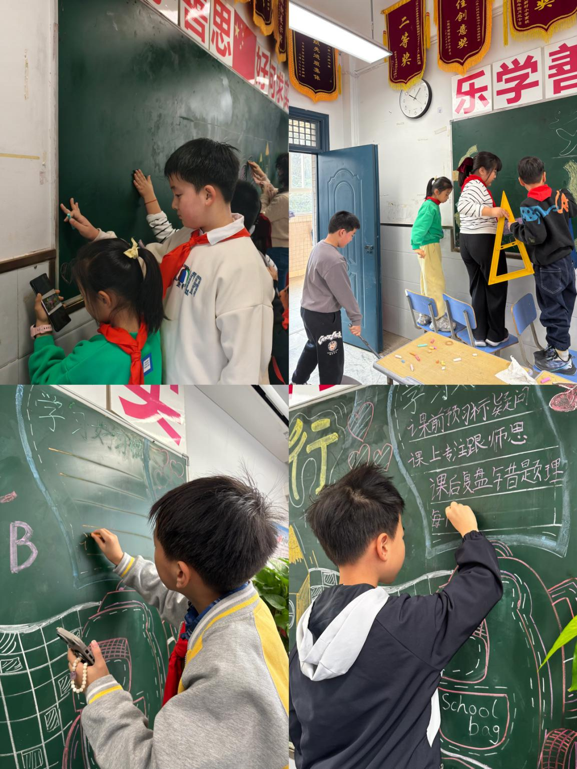 一到教室,队员们纷纷化身“文明小使者”“爱心小画家”,创作在热烈的讨论中开始。他们拿出事先搜集的资料,精心设计、巧妙构图,用五彩的粉笔描绘出心中的文明与关爱。瞧!他们有的自告奋勇承担起主笔的任务,稳稳地站上椅子,用粉笔勾勒出主体轮廓;有的仔细比对,确保颜色搭配恰到好处;有的则默契配合,一个负责描绘高处醒目的标题,另一个则用湿抹布充当“橡皮擦”,不断调整和完善细节;还有的将搜集来的礼仪规范编成朗朗上口的短句,并工整地誊写在黑板预留的“书卷”与“花朵”之中。