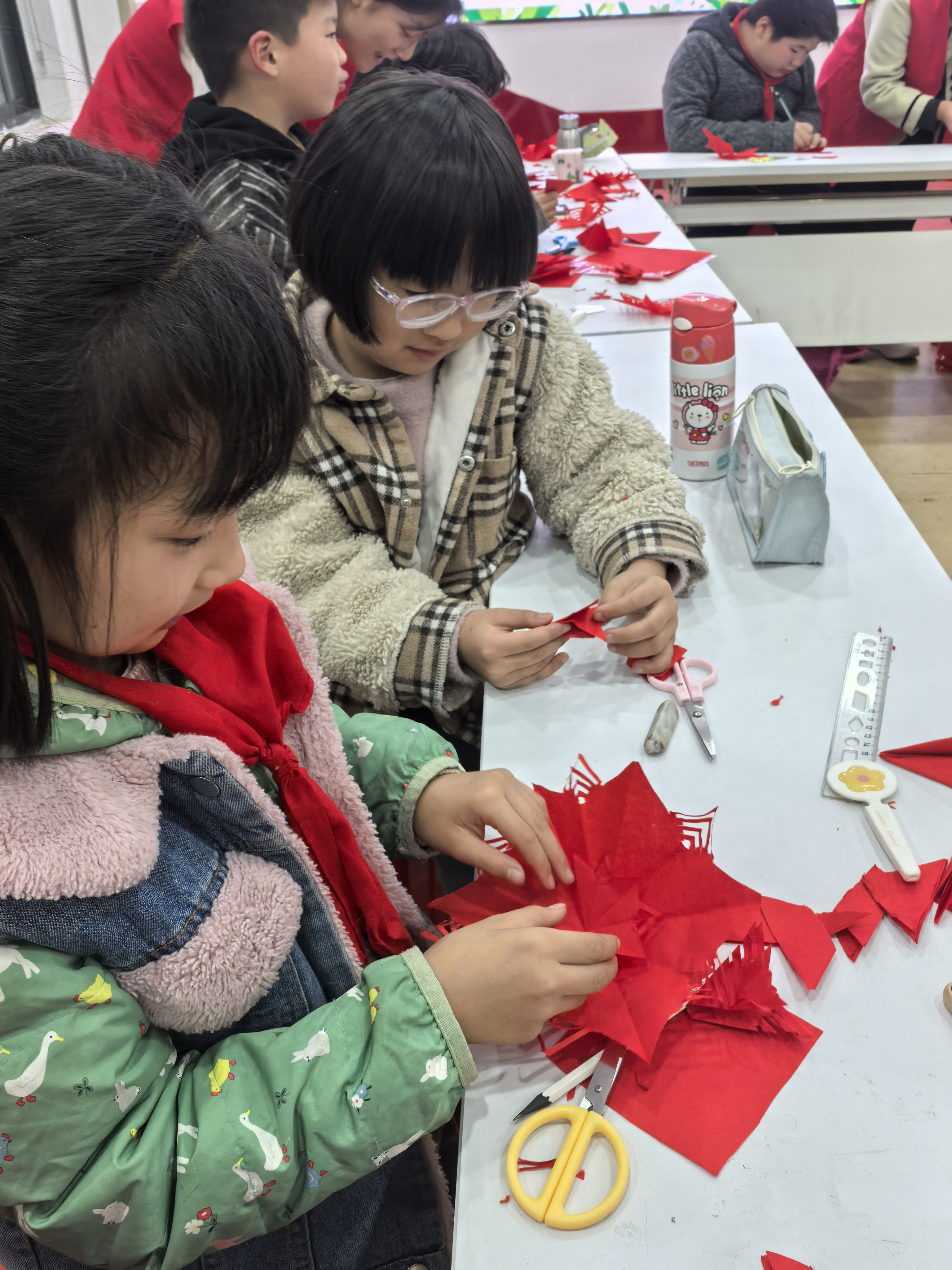 活动现场,志愿者以“纸的起源与艺术价值”为切入点,用生动的动画和实物展示,为孩子们科普纸艺文化知识,激发探索兴趣。随后的手工实践环节,志愿者分小组教学,从各种的五角星制作,耐心指导孩子们折叠、剪裁、粘贴。过程中,孩子们积极提问、互相帮助,小苑工作站工作人员全程协助维持秩序,保障活动安全有序。