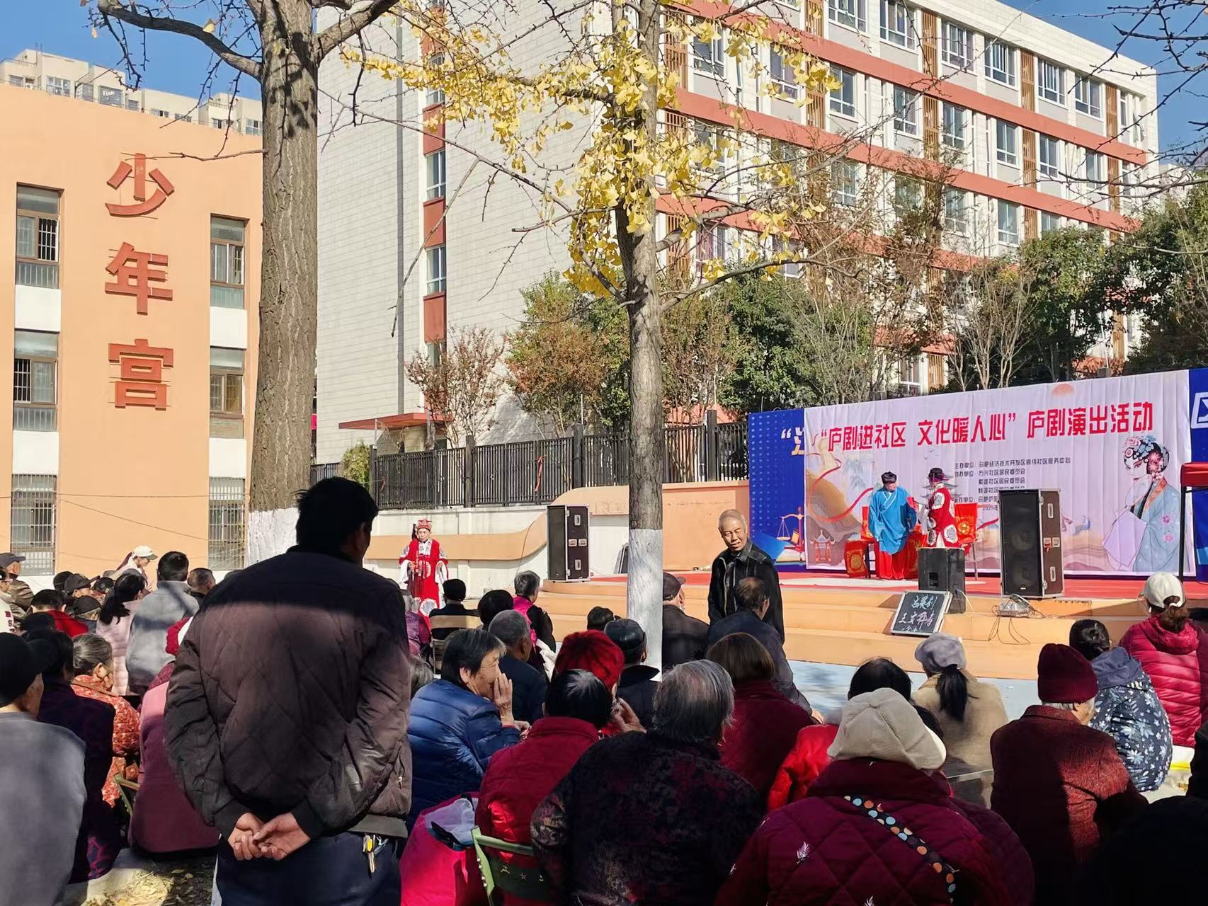 丝竹和鸣,雅韵启幕。11月29日下午,合肥经开区锦绣中心方兴社区志愿服务广场人头攒动,悠扬的庐剧唱腔回荡在社区上空,由锦绣中心党群部主办的“庐剧进社区 文化暖人心”系列演出在此正式启幕。作为系列演出的重要站点,方兴社区将在11月29日、30日及12月6日、7日四天迎来精彩演出,这场贯穿9天的文化盛宴,让方兴居民在家门口就能尽享传统戏曲魅力,在潜移默化中接受文化熏陶与安全教育。