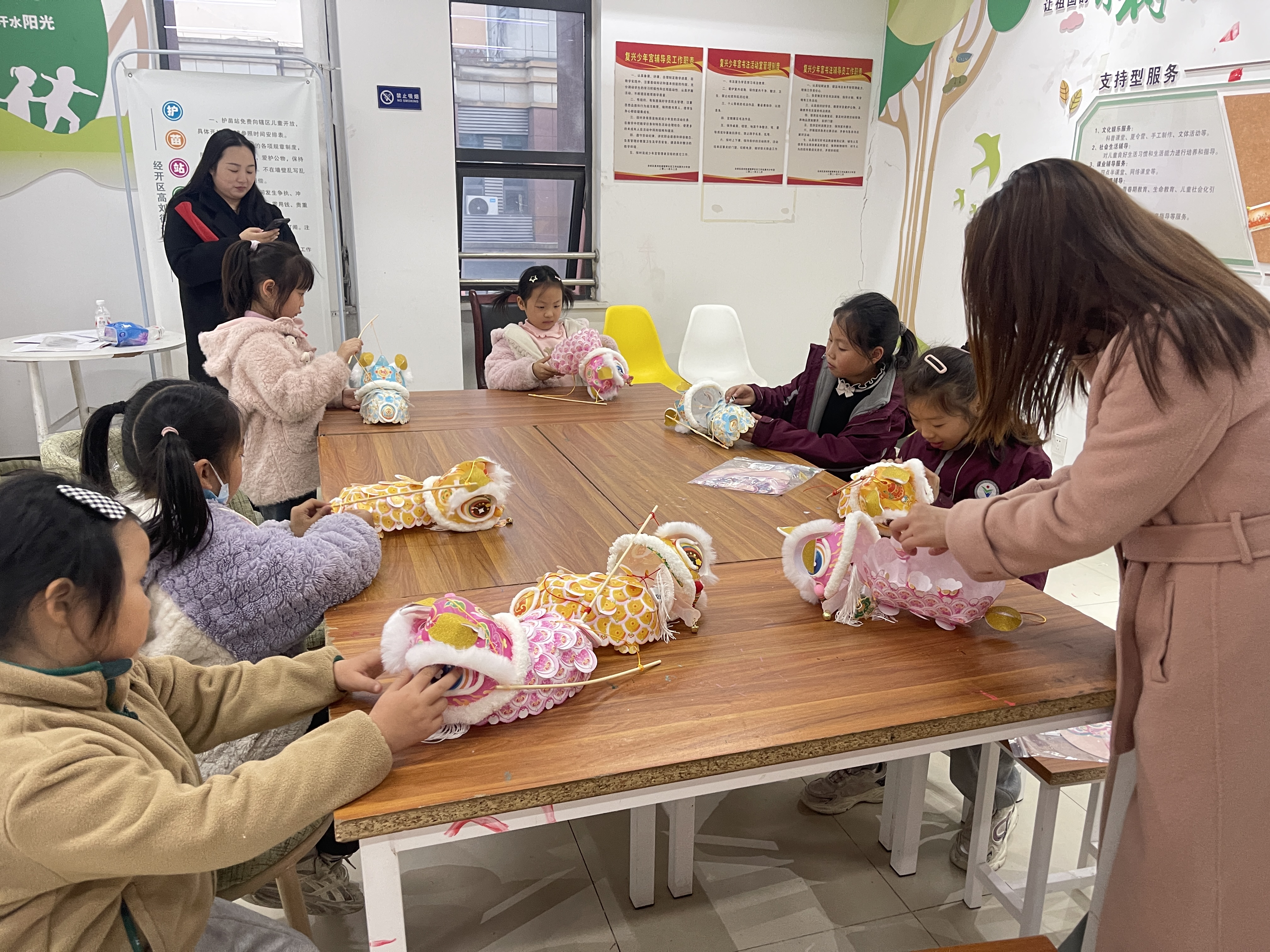 活动伊始,社区工作人员首先以生动有趣的故事,为孩子们介绍了醒狮这一国家级非物质文化遗产的悠久历史与文化内涵。孩子们听得津津有味,了解到醒狮不仅是吉祥与勇猛的象征,更承载着人们祈求平安、丰收的美好愿望。这番讲解,为接下来的手工制作铺垫了浓厚的文化氛围。随后,DIY环节正式开启,工作人员为每位孩子分发了醒狮灯笼材料包,耐心讲解制作步骤和注意事项。孩子们立刻投入其中,有的认真粘贴狮头纹饰,有的专注勾勒灯笼轮廓,有的互相交流制作技巧。遇到困难时,孩子们主动向工作人员请教,现场氛围热闹而有序。经过一个多小时的巧手创作,一个个色彩鲜艳、形态各异的醒狮灯笼逐渐成型,孩子们提着自己的作品互相展示,脸上洋溢着自豪与喜悦。